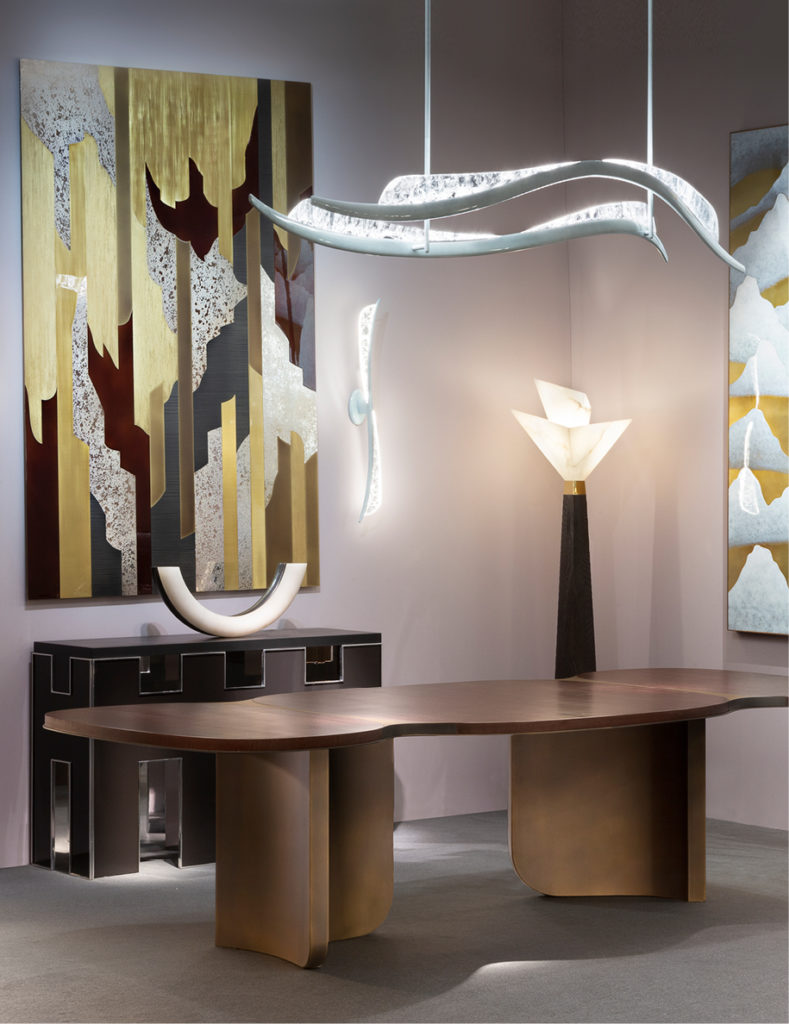 For the first time this year, Galerie Philia joined the celebration to present an organic and poetic installation exploring contrasts through new works by fourteen of its international designers and artists. Among the highlights are three creations by the Italian Pietro Franceschini, a marble candelabrum by the Mexican Andres Monnier, a table by Studiopepe, a chair by Rick Owens, and an oil painting by Nicolas de Staël.