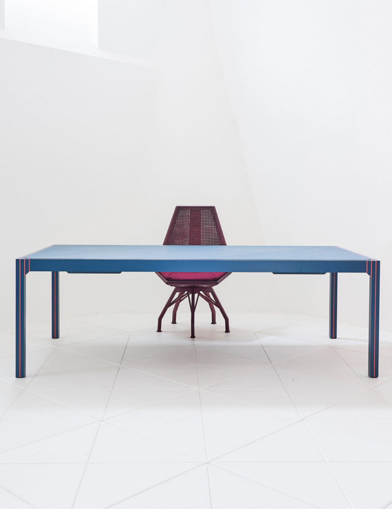 Orange velvet carpeting covers the floor of the five compartments, one of which – where the bed is located – is dressed in an ethnic fabric from Edinburgh Weavers. To its right, a bespoke bar, clad in stainless steel, plunges the guest into a time capsule. Vico Magistretti’s Chimera lamp illuminates the living room, while designer Axel Chay’s lamp opposes the large window in the entrance.