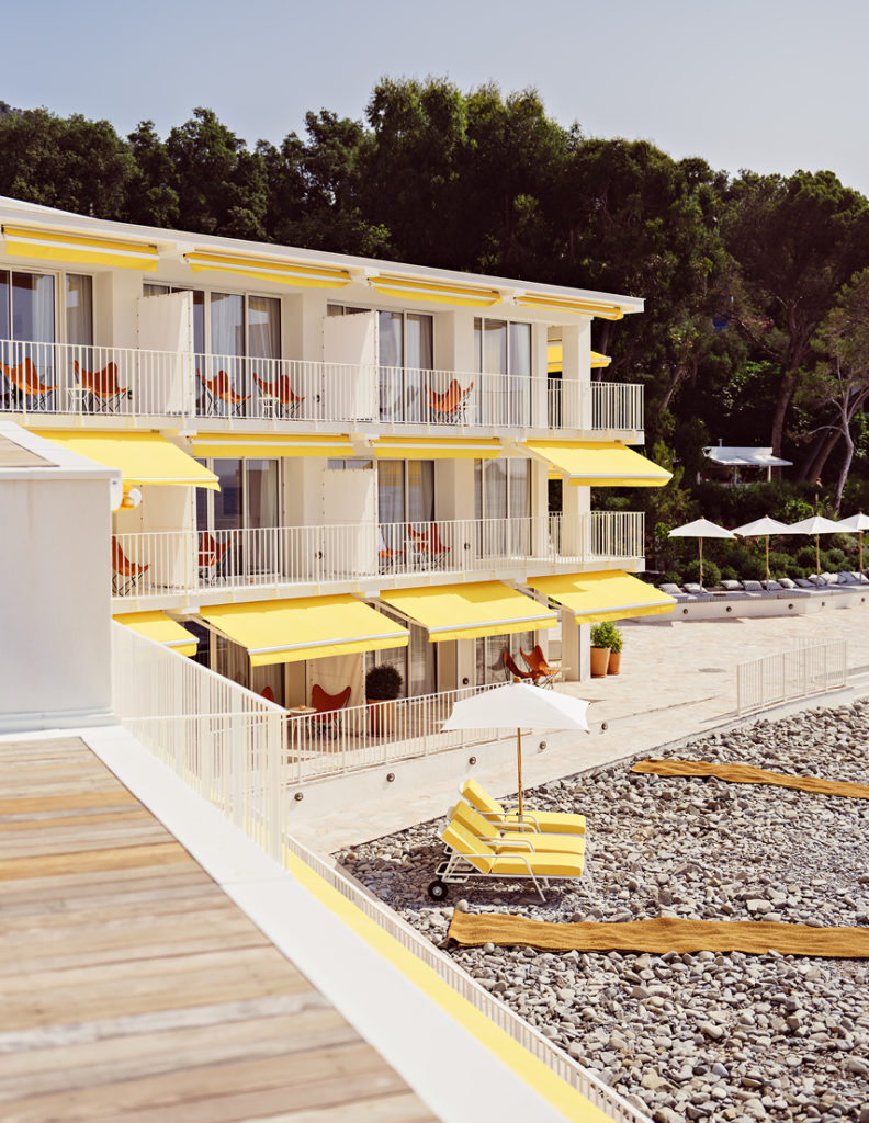 The interior architect Charles Zana infused the hotel with a sunny spirit using ceramics, linen fabrics, canisse-style ceilings and woven carpets. In the garden, the landscape designer Jean Mus brought the scent of the maquis, myrtle and rosemary to the hotel. On the walls, gallery owner Amélie du Chalard displayed abstract works and invited Alexandre Benjamin Navet to imagine a colourful fresco in the restaurant (run by Beefbar). A vibrant tribute to the Saint-Tropez of yesteryear.