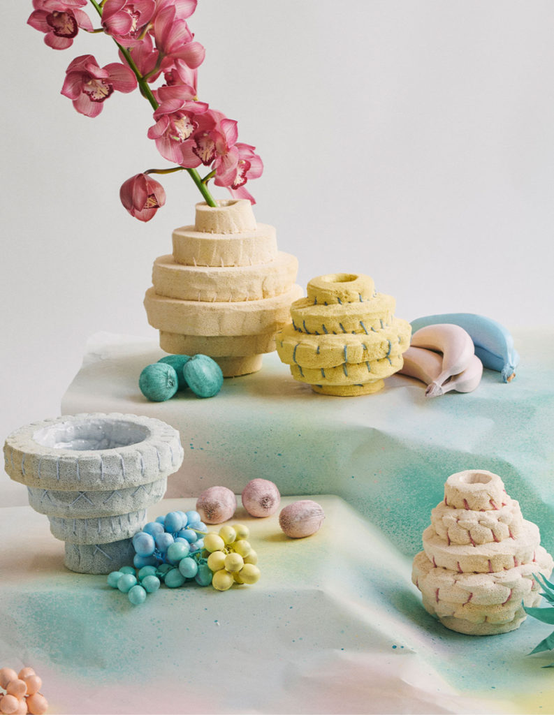 Parmi elles, les tables Tavolo Morbido reconnaissables par leur anatomie singulière : quatre blocs arrondis en guise de pieds surplombés par un plateau aux teintes bonbon. Des créations à la délicatesse feutrée qui explorent la matérialité et la tactilité du verre, du béton coulé, du marbre, et surtout du terrazzo, matériau divinisé par le duo depuis son voyage en Italie, pays natal de Nonno Mignone, la mère d’Aldo. Le bal des mignonneries est ouvert !
