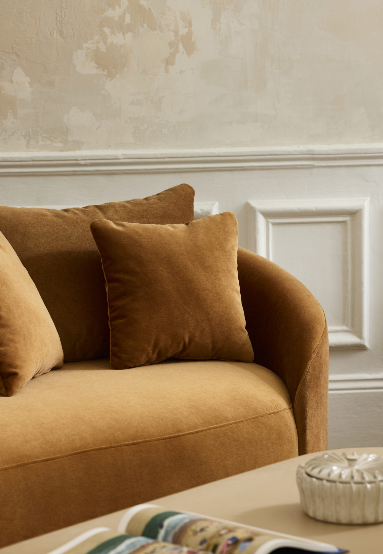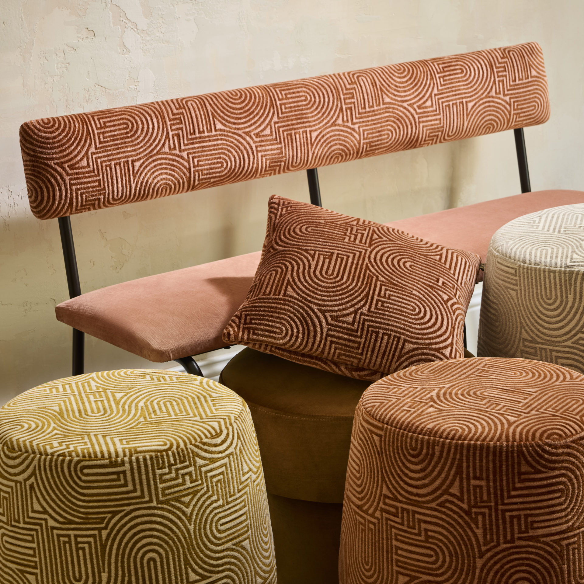 L’esthétique crépusculaire traverse particulièrement l’univers de Madura. Sur les rideaux Dalila et Klark, sur les sièges Ysabeau, mais aussi sur le pouf Leah, les étoffes s’embrasent et se patinent : jaune safran, camel doré, pêche, corail, caramel… Au gré des matières et tissages (jacquard, coton, laine, chenille), les touchers se font tour à tour sensuels, élégants, enveloppants, résolument réconfortants.