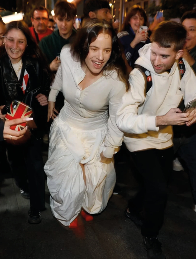 Durant toute sa promotion, Rosalía pousse le jeu liturgique jusqu’au clin d’œil papal. L’anneau du pêcheur argenté, les mules en cuir rouge, la soutane blanche, le salut hiératique, mais aussi l’annonce de l’album en mode « Habemus album »… Elle emprunte les codes de la papauté non pas pour prêcher, mais pour signer son propre couronnement avec dérision, affirmant une direction artistique totale, à la fois mystique et conceptuelle.