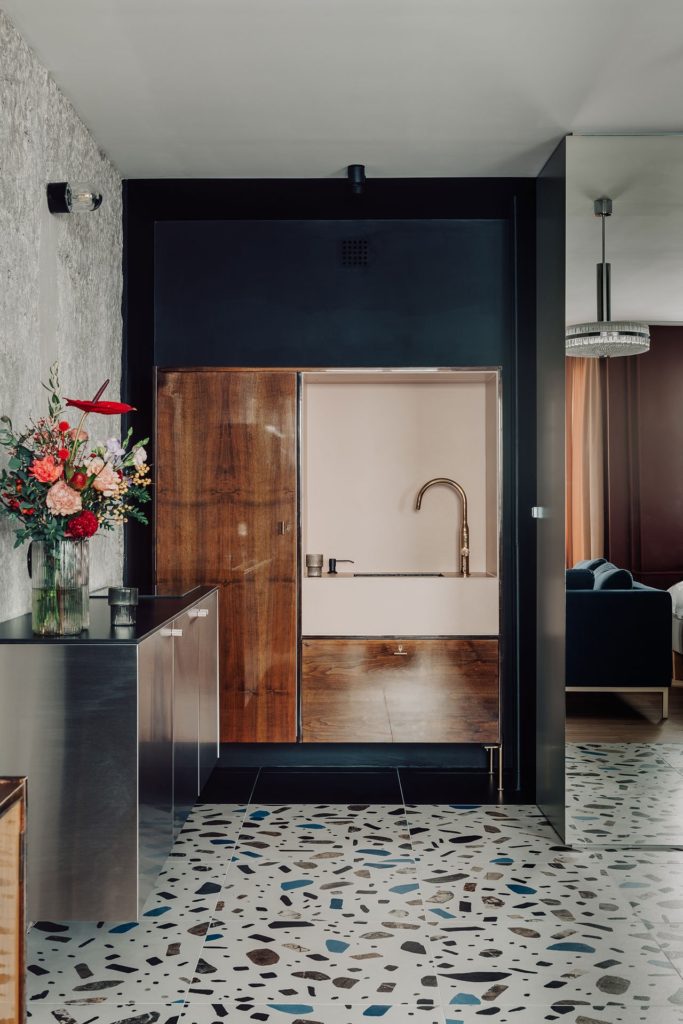 Far less reflective and flashy than mirror, stainless steel nonetheless brings a dose of light with a touch of uniqueness. In addition to all its functional qualities (durability, resistance, ease of maintenance, hygiene...), stainless steel adds a beautifully industrial metallic note. Special mention to its use in the Pauline Borgia project.