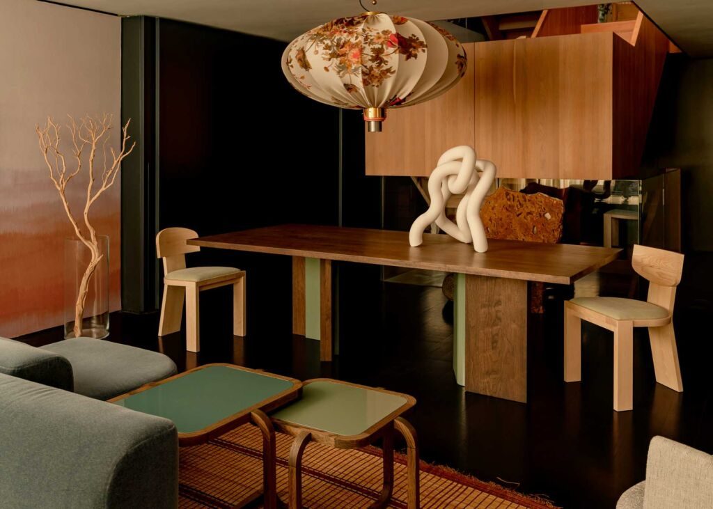 Une fois à l’intérieur, c’est la dynastie Ming qui s’impose : hauts plafonds et chevrons en bois, soie de thé xiangyunsha, structures en teck inspirées des lits à étages classiques, rideaux de perles de bambou… Le studio local atelier suasua fait fi du temps et transporte la marque australienne dans l’histoire du vieux Pékin.