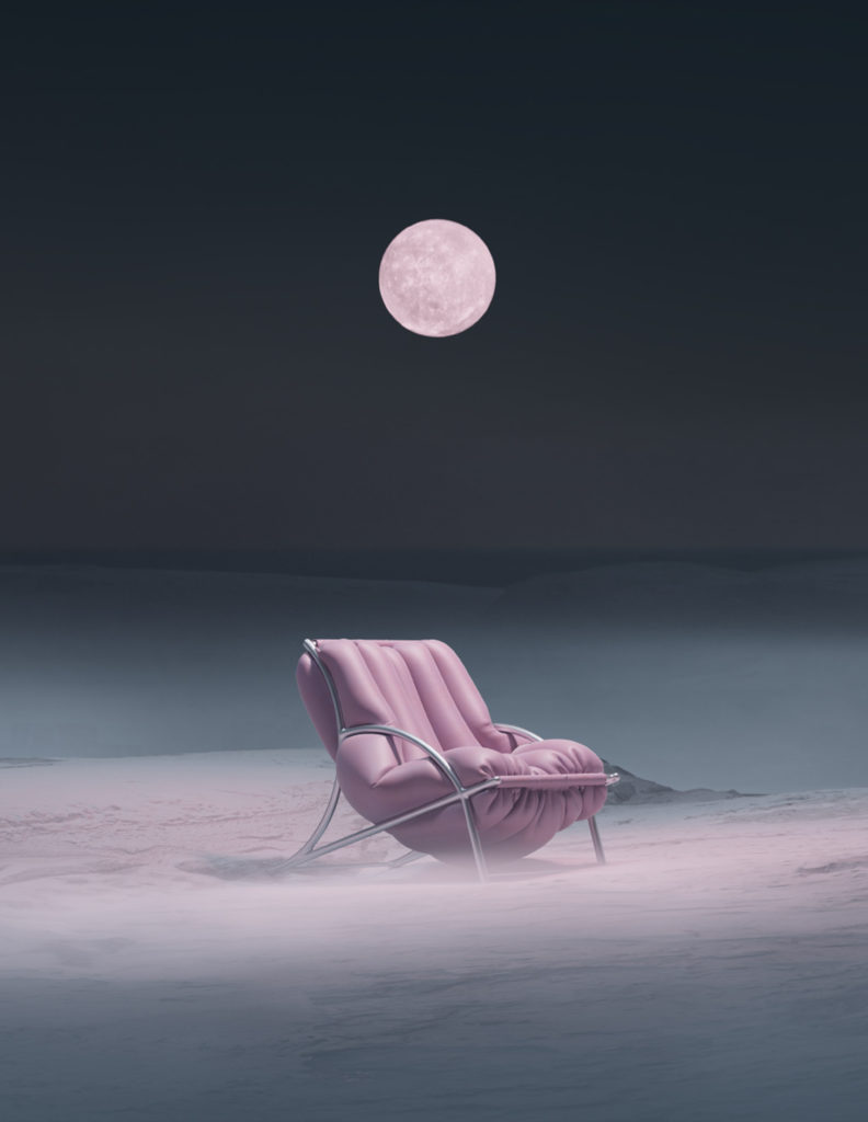 Avec le ciment brut pour toile de fond, l’espace de travail multifonctionnel puise ses codes minimalistes dans l’univers numérique surréaliste de l’artiste espagnol. On y retrouve par exemple le rose blush onirique signature de Reisinger distillé par touches, mais aussi sa chaise Hortensia posée au milieu du décor comme une NFT extraite du métavers.