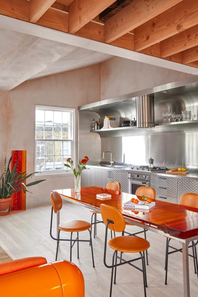 Côté mobilier, les références sont aussi riches et variées : bureau en chêne sur mesure, chaise en acier chinée, meuble industriel jaune d’USM, canapé Terrazza De Sede, chaise rose en tissu Moustache Editions… Un mélange d’époques et de genres pour un intérieur décalé à souhait. Visite.
