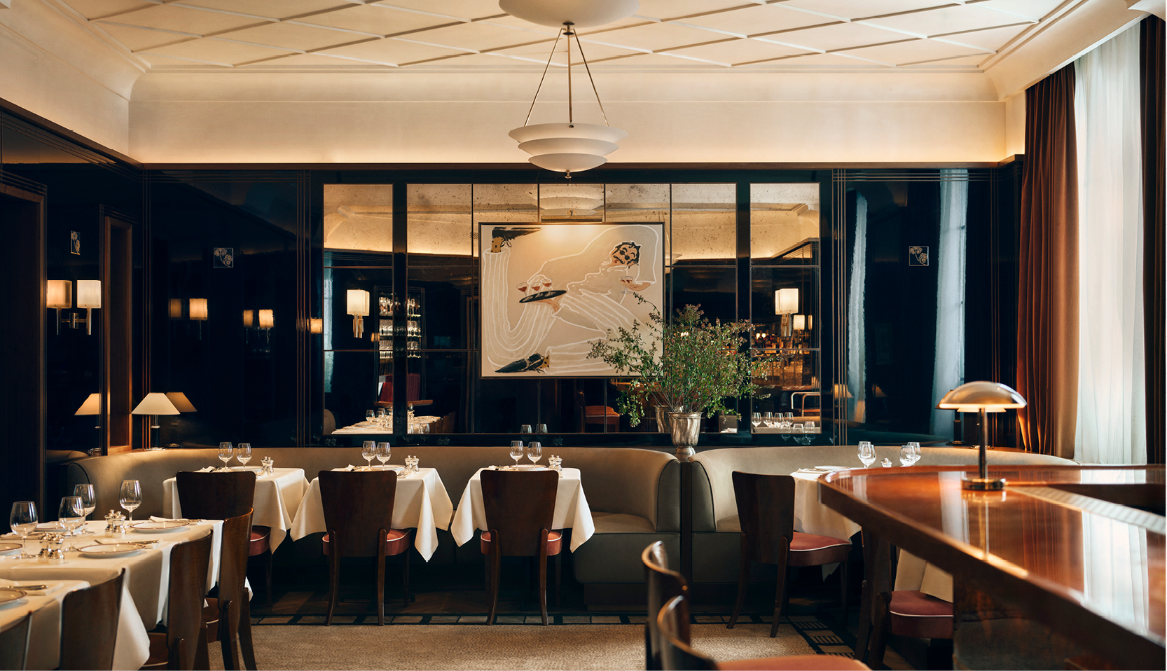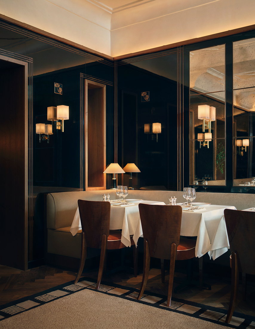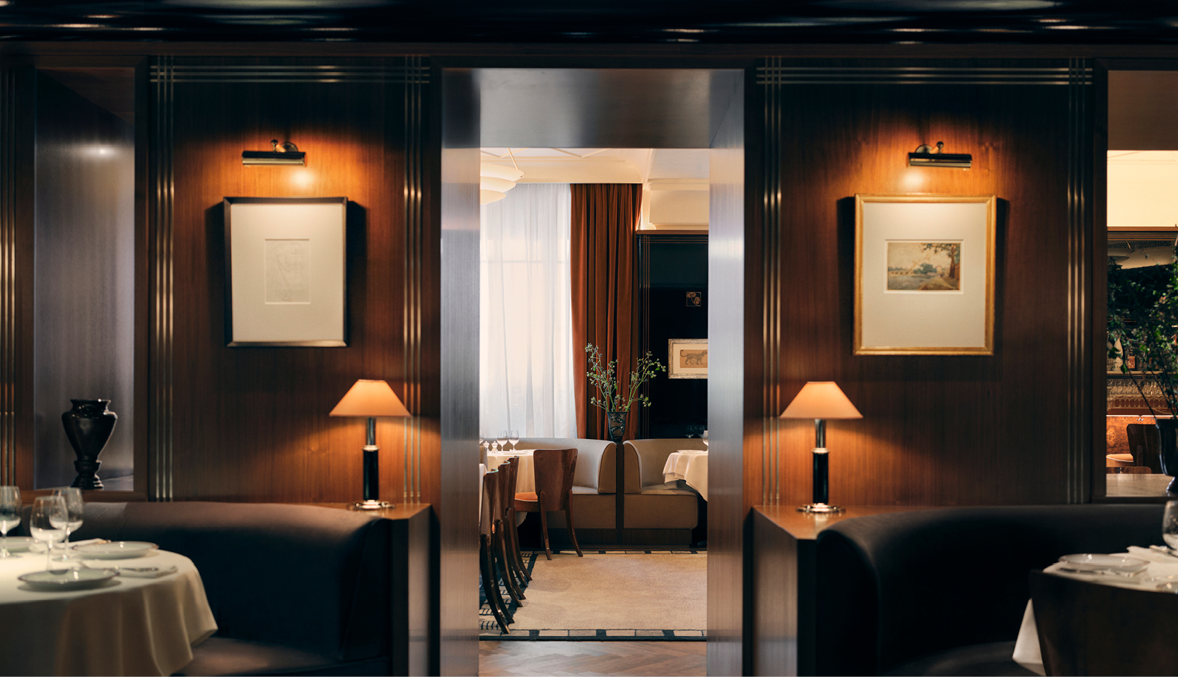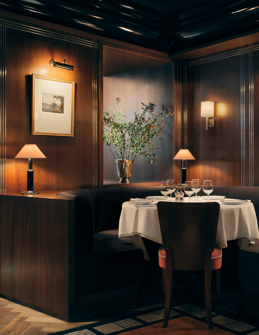 Une fois à l’intérieur, l’ambiance des bars de jazz de Brooklyn se glisse aux confins d’un bistrot parisien discret, où flotte un parfum de Godfather. Le décor, finement scorsesien, est signé Sarita Posada (l’architecte colombienne basée à New York à qui l’on doit les boutiques Aimé Léon Dore), épaulée par Lana Sawiris. Elle y distille des boiseries précieuses soulignées de filets en laiton, des banquettes en velours, des tables coiffées de nappes immaculées, des surfaces en marbre rouge italien, tapis et lampes Art déco… Cherry sur le gâteau : en fond, une bande-son jazz installe le ton, et plus tard, le hip-hop rétro prend le relais.