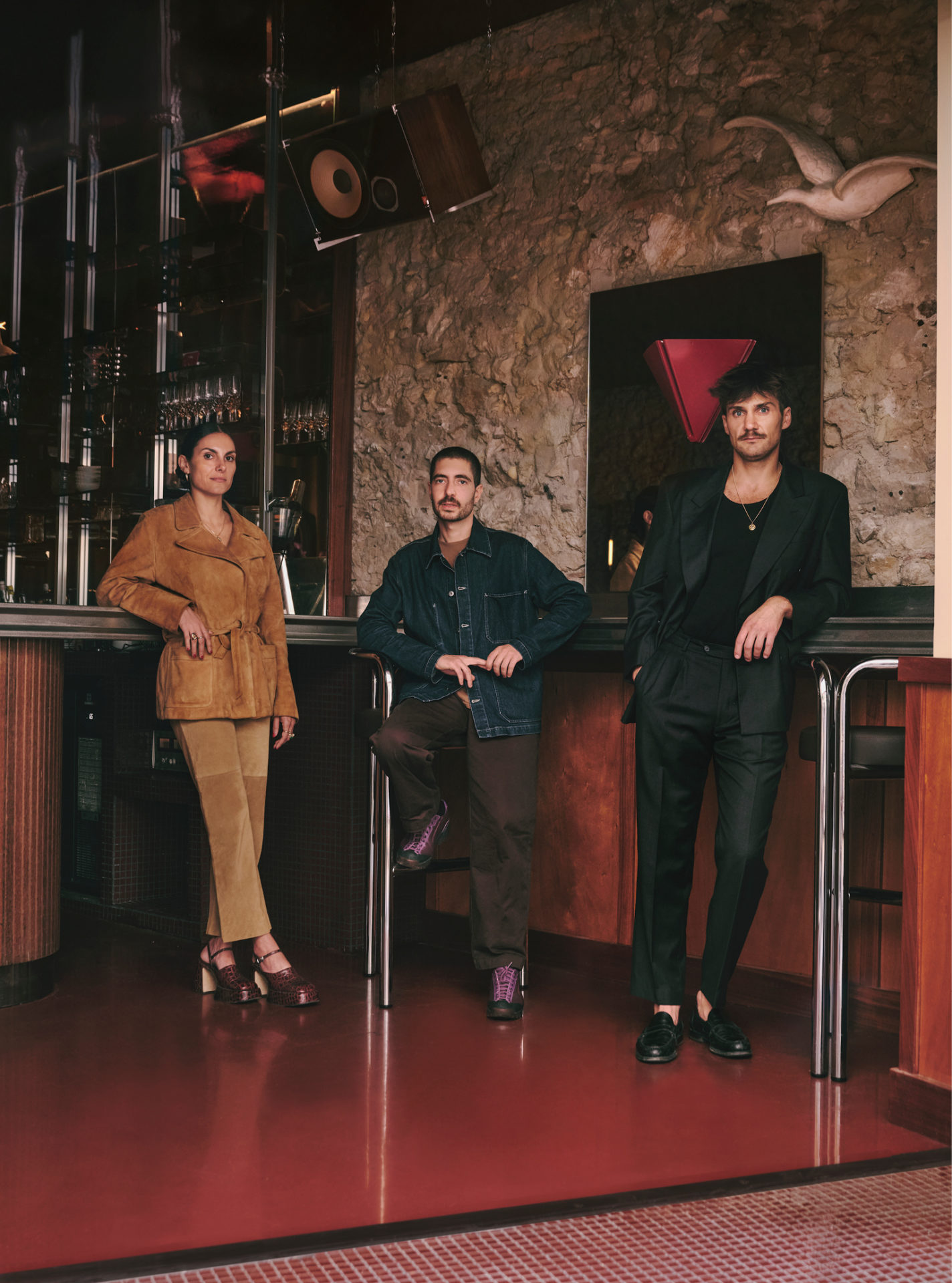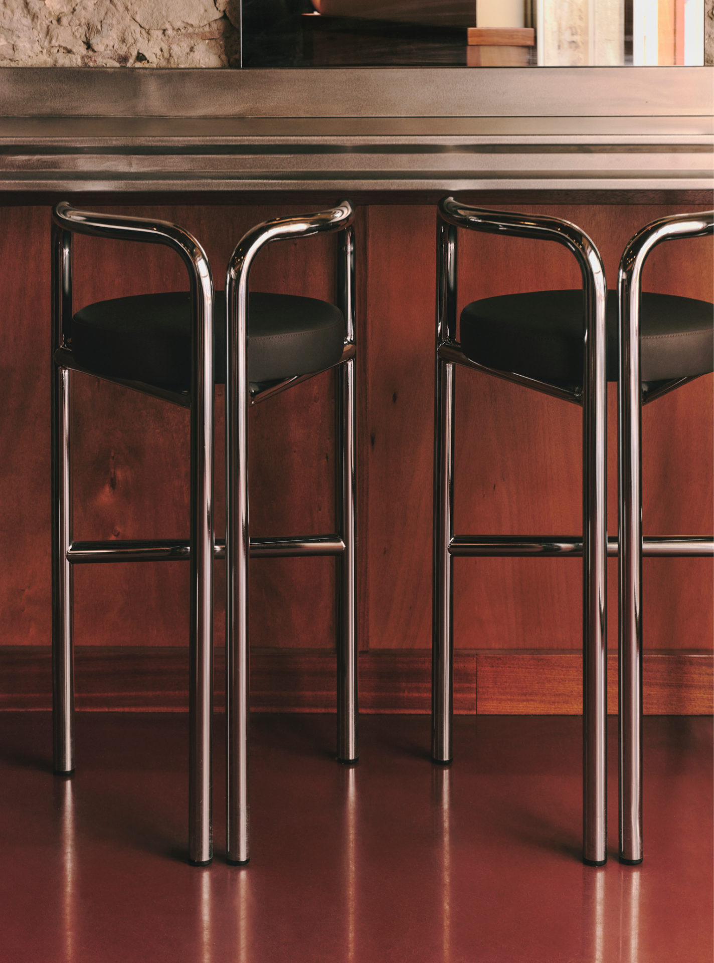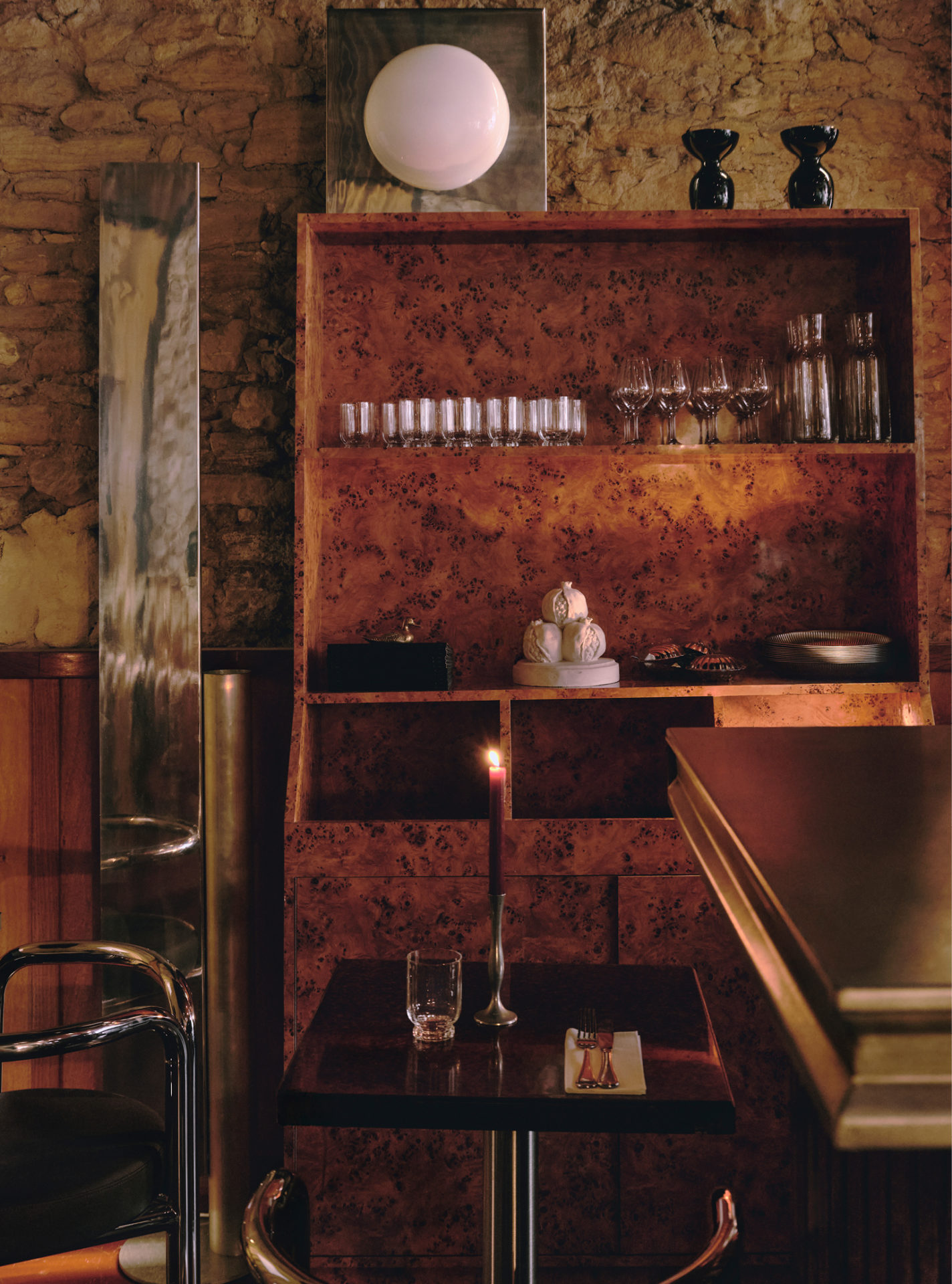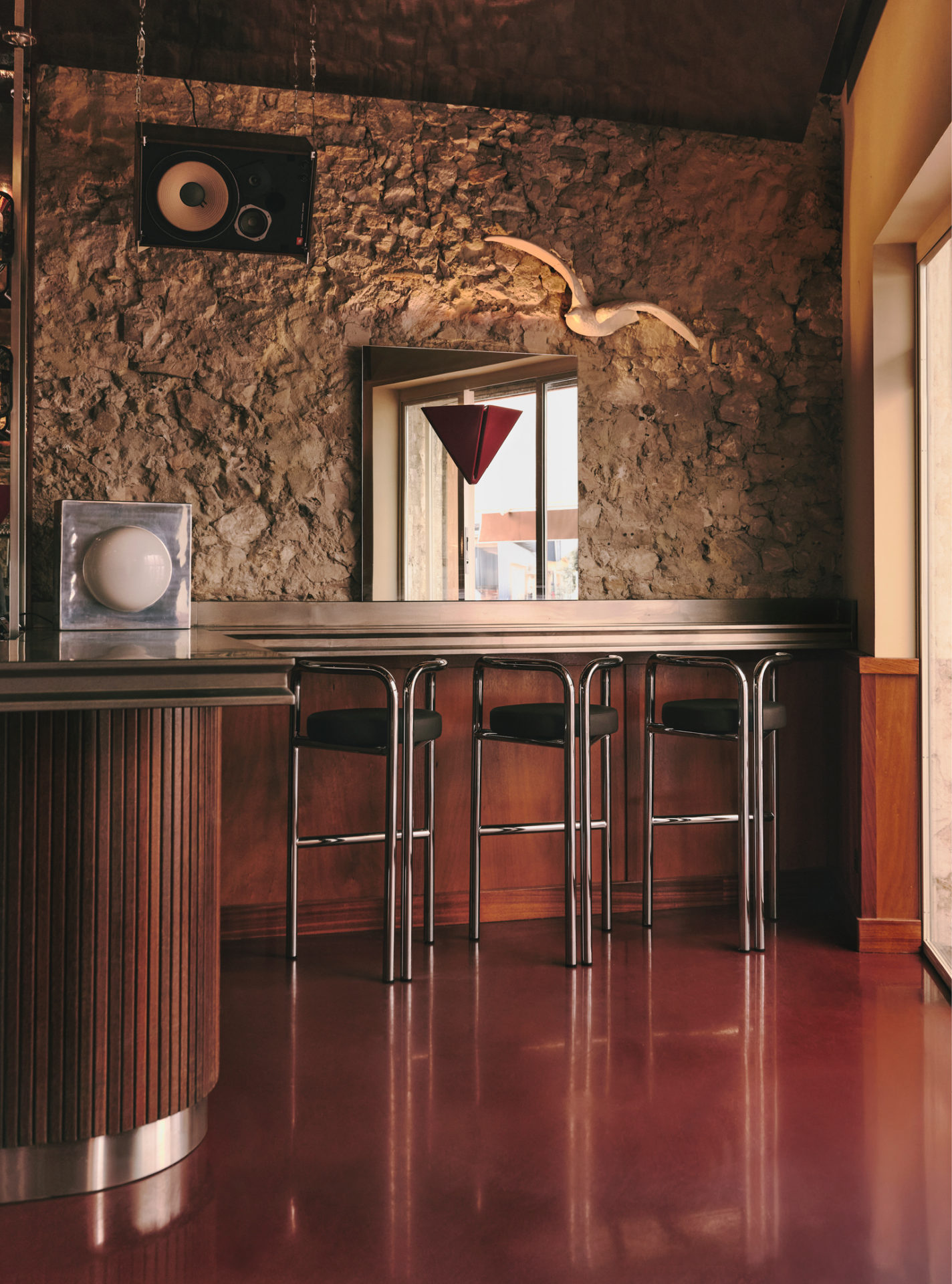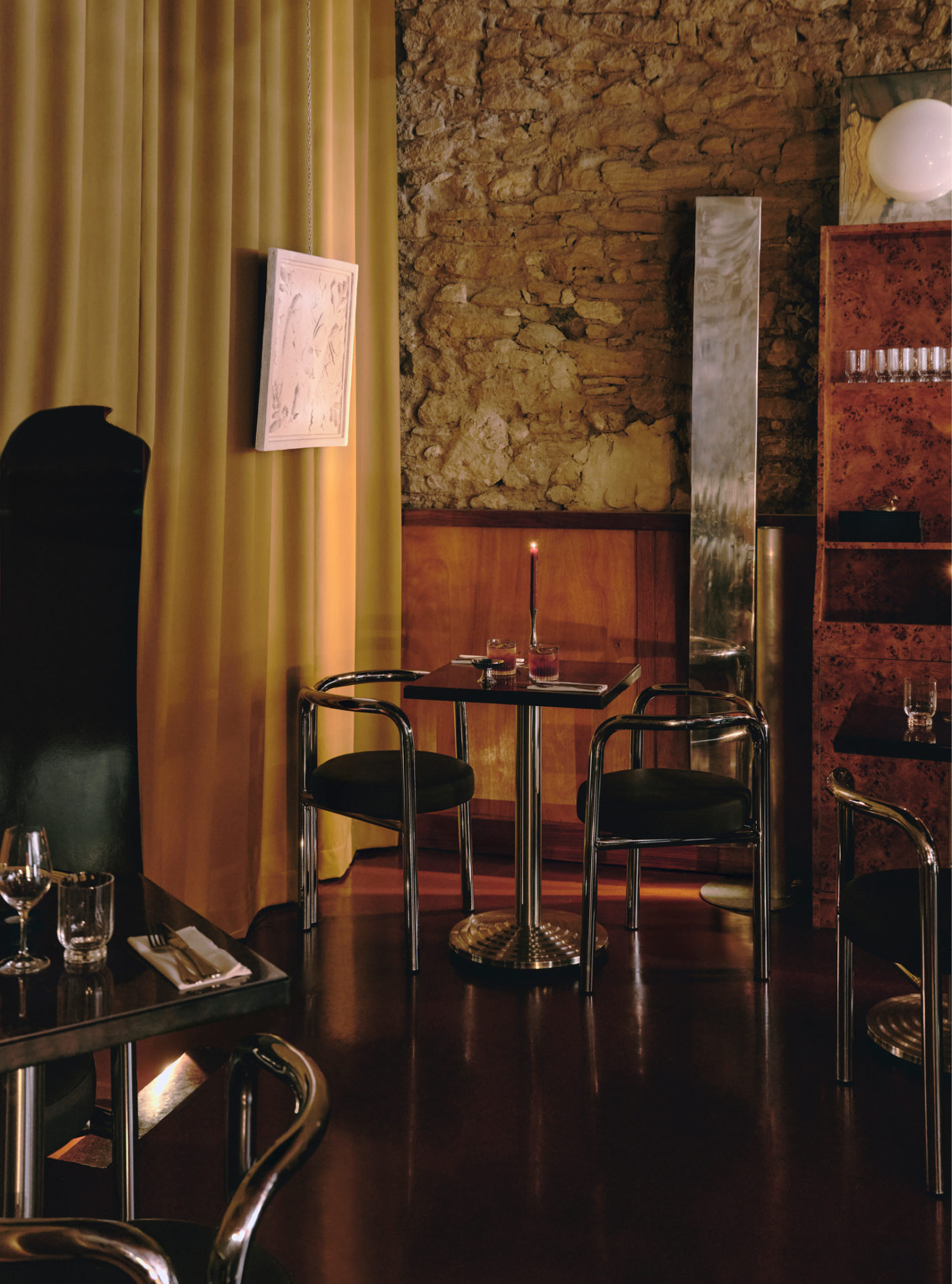 Aux commandes du décor, le couple fait son cinéma, entre références rétro et minimalisme graphique. Boiseries en okoumé, sol en résine bordeaux, comptoir en zinc, chaises tubulaires, grands rideaux satinés vert d’eau… Les volumes restent simples, mais chaque détail est mis en scène.