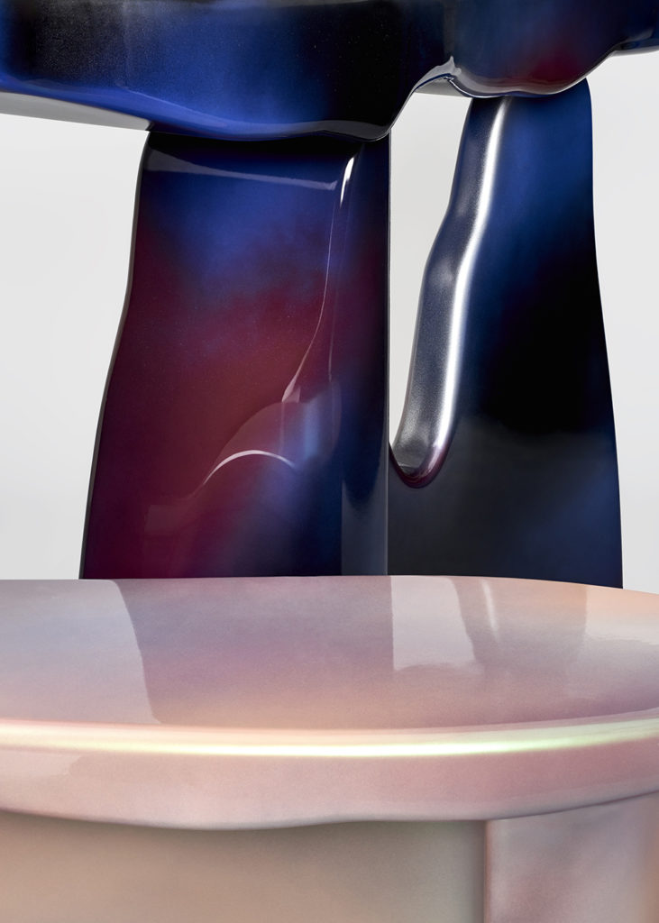 Ces créations, aussi régressives dans leurs formes que dans leurs fonctions, sont complexifiées par une matériauthèque sensible et précieuse : faïence, verre, acajou… Démonstration.
