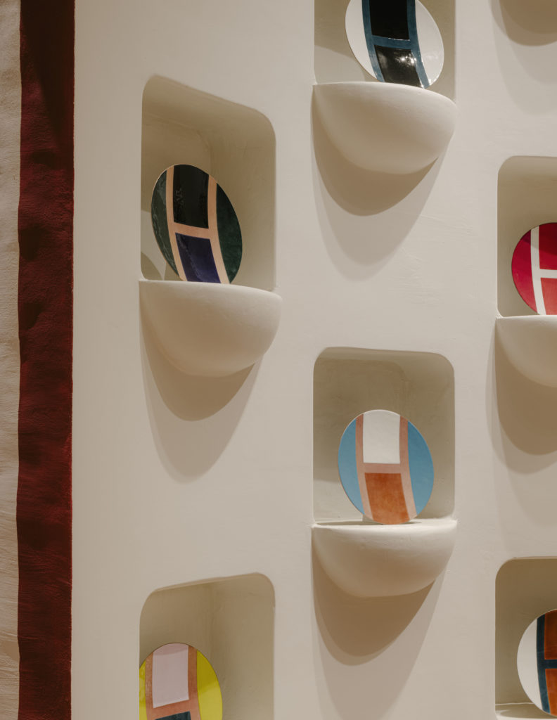 La scénographie, signée Luna Duchaufour-Lawrance, met en scène la dimension durable de l’initiative via des réalisations en terre rouge façonnées à la main et sans cuisson dans la briqueterie Lanter, à une quarantaine de kilomètres de la cristallerie.