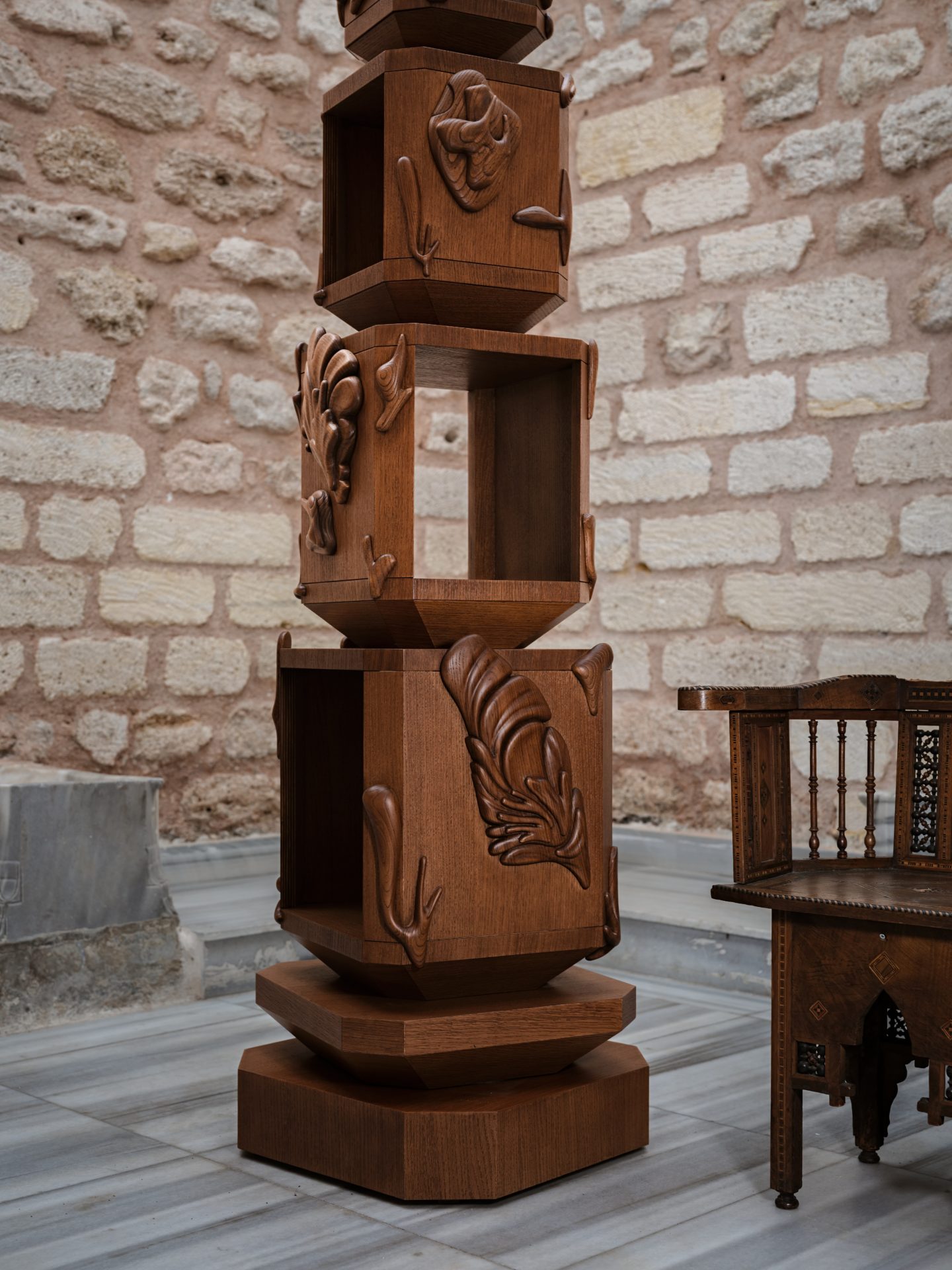 Premier jour – Le studio de design Ahu présente pour la première fois « Nahıl » à l’espace Boon_Monceau. La collection se déploie en une série de totems domestiques, allant d’armoires monolithiques à des tables en marbre, pensée comme un héritage culturel où l’artisanat devient rituel.
