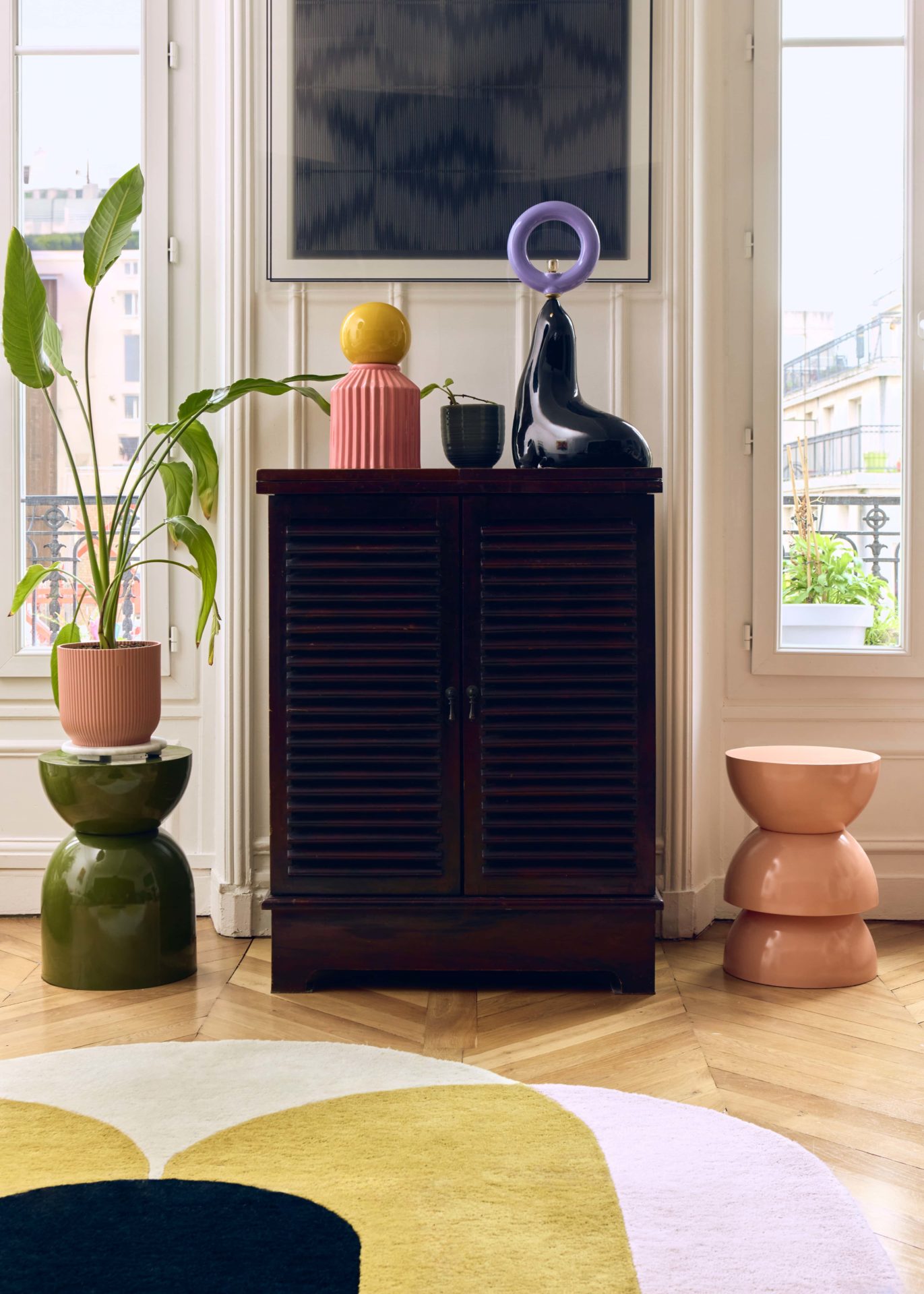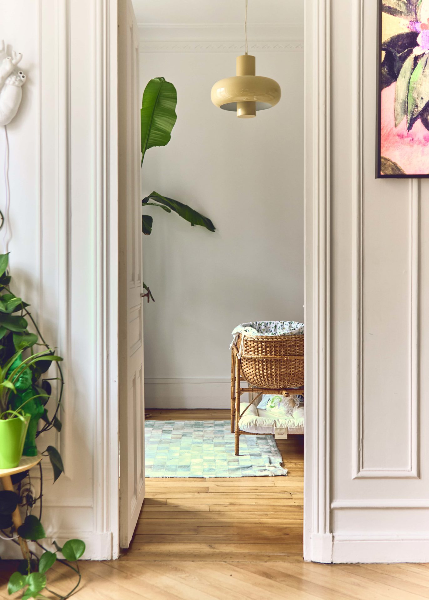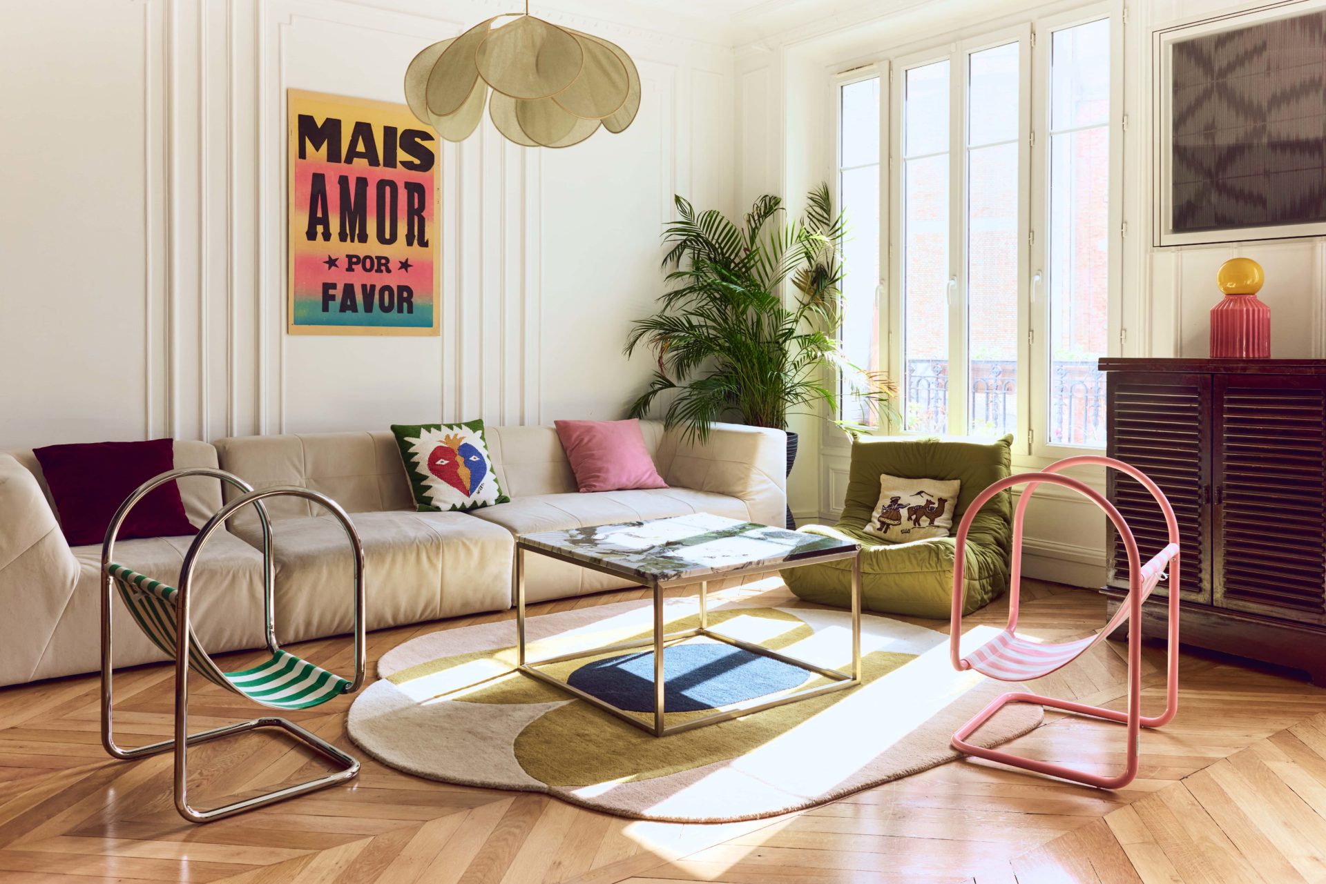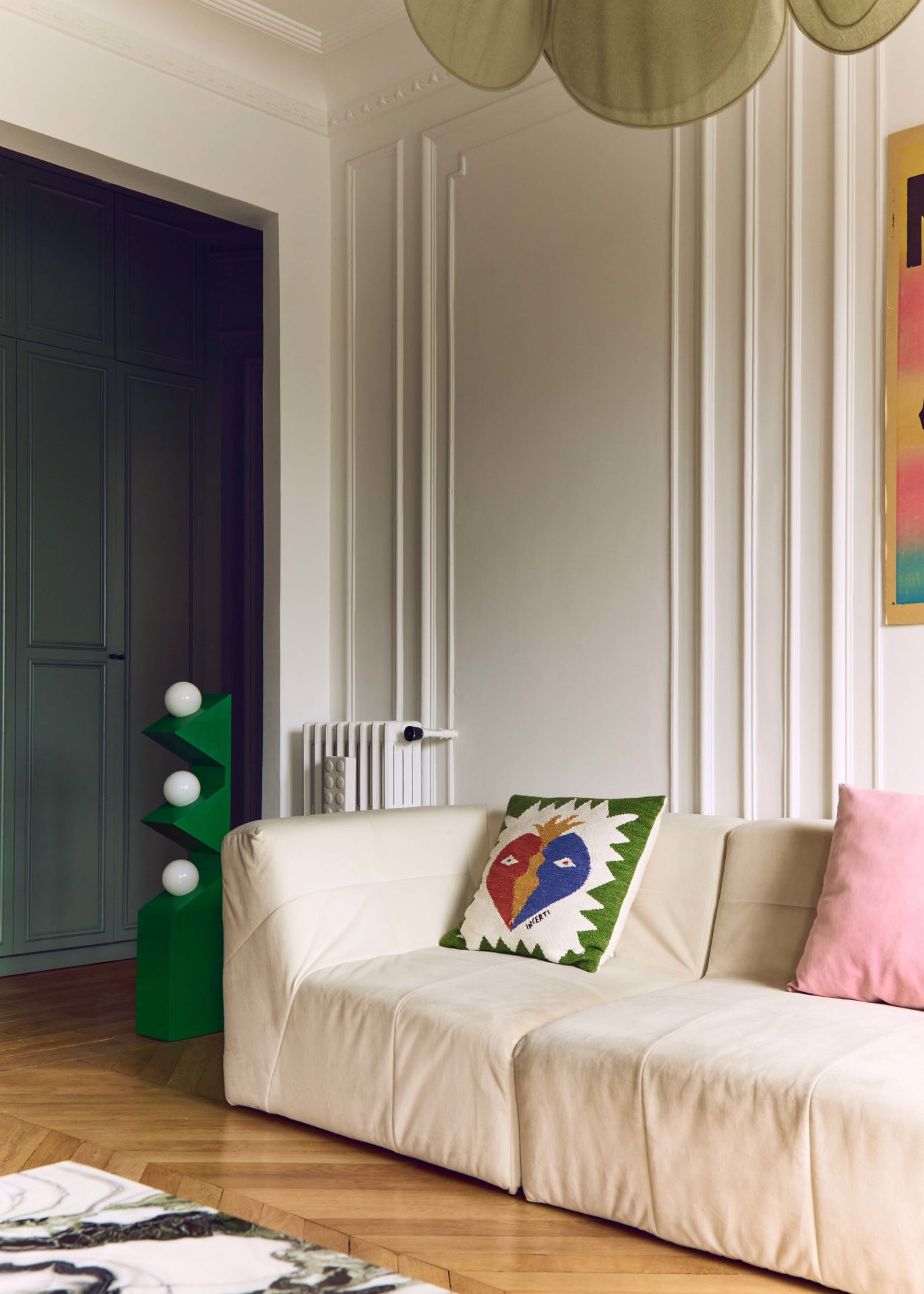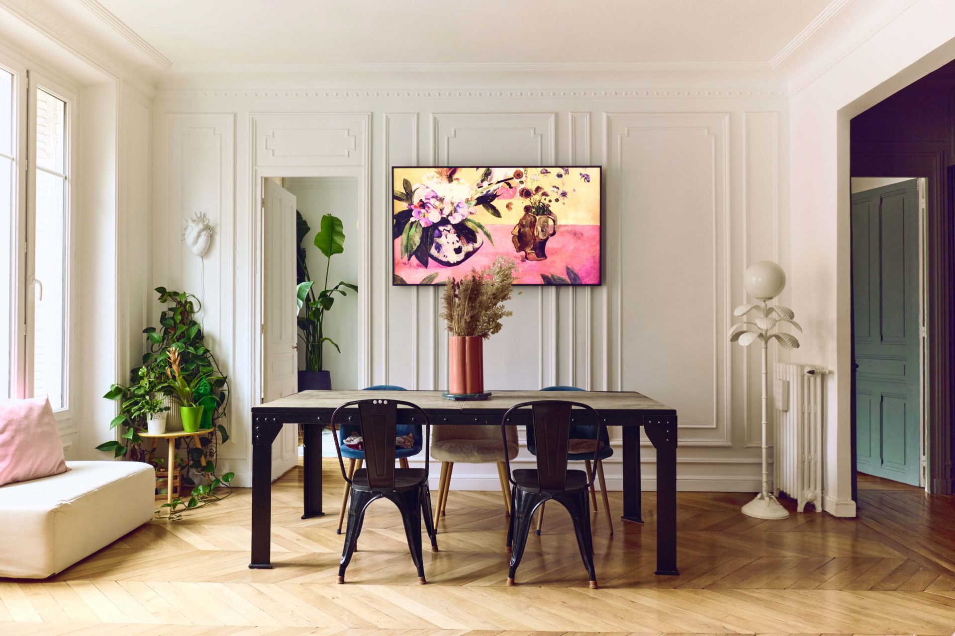 Maintenant que les éléments techniques sont posés, place au style. Ici, l’Haussmannien joue sur deux registres : d’un côté, les codes parisiens classiques s’imposent avec des moulures blanches immaculées, une belle hauteur sous plafond ; de l’autre, un style plus tranché, moderne et coloré rythme le quotidien.