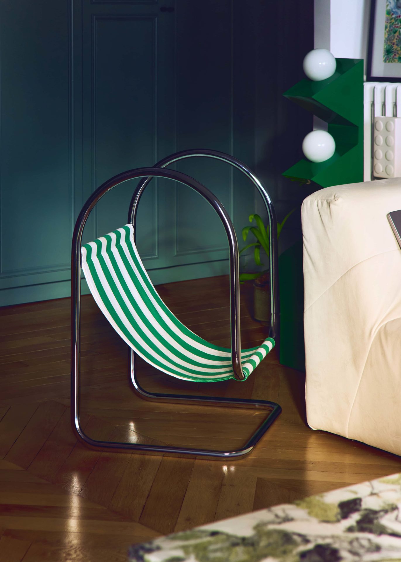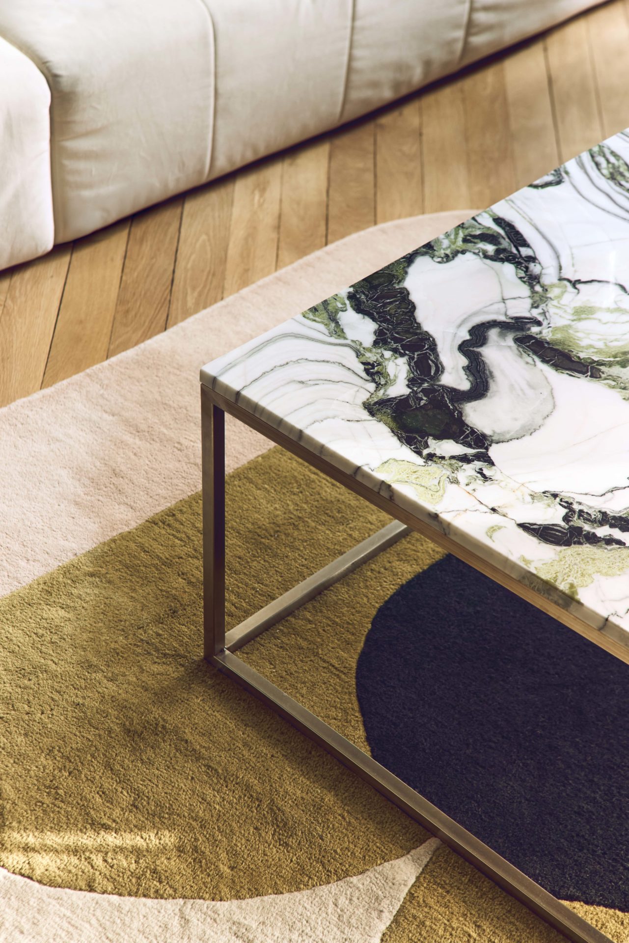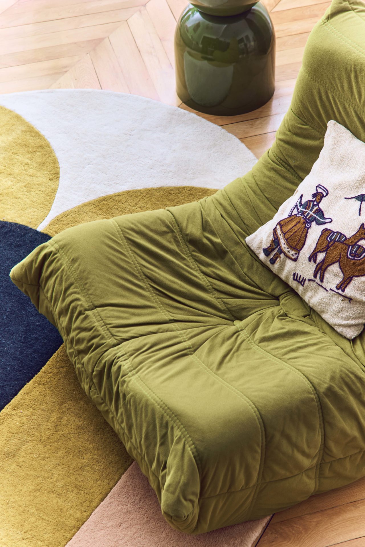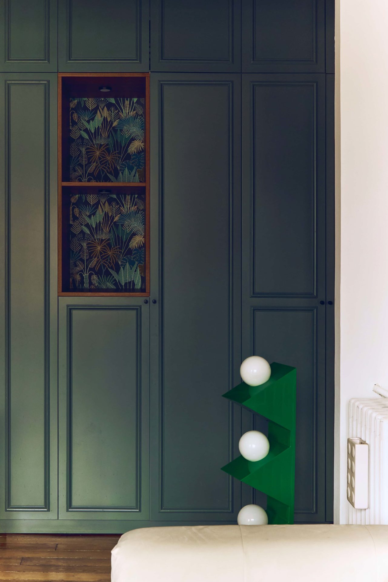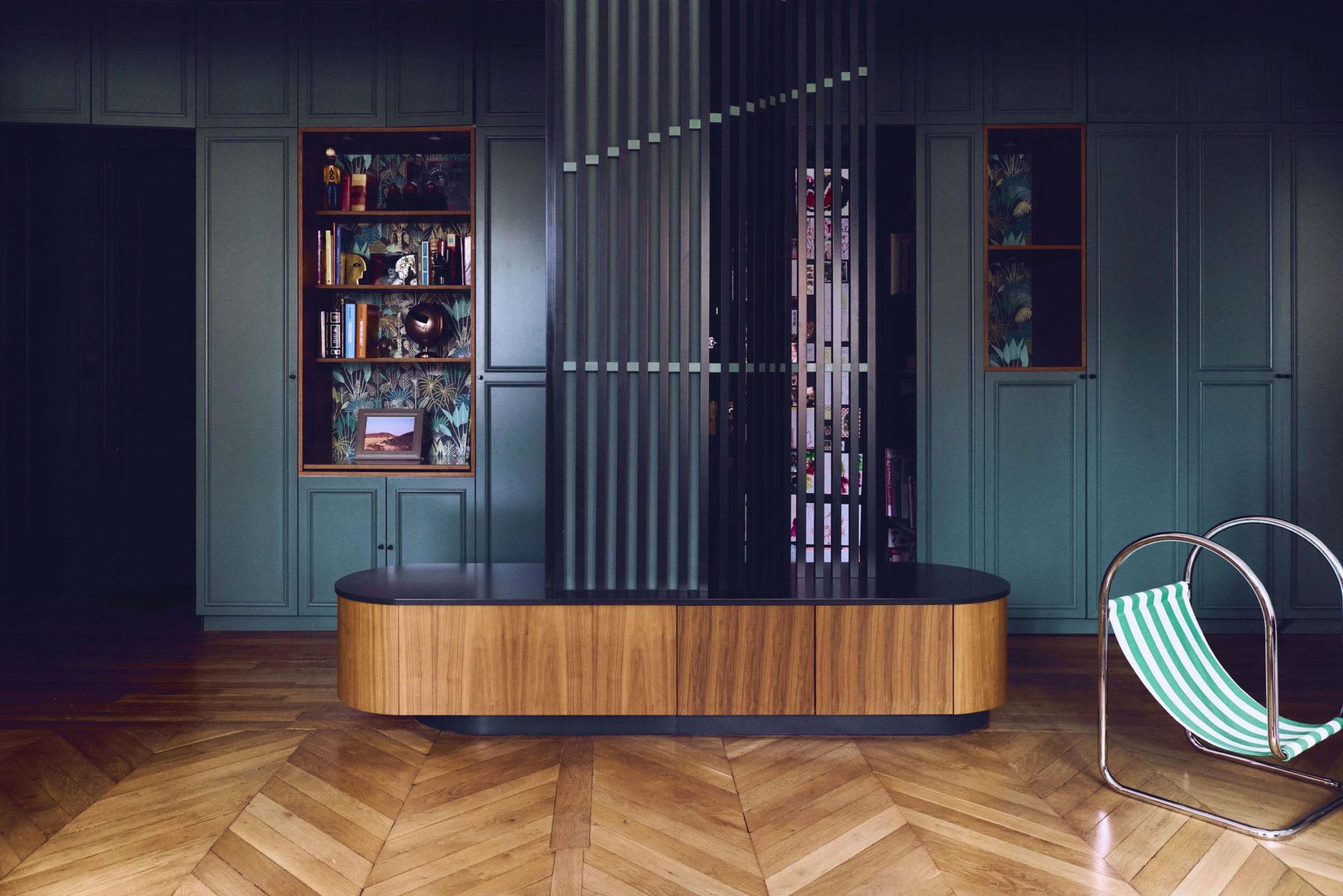 Maintenant que les éléments techniques sont posés, place au style. Ici, l’Haussmannien joue sur deux registres : d’un côté, les codes parisiens classiques s’imposent avec des moulures blanches immaculées, une belle hauteur sous plafond ; de l’autre, un style plus tranché, moderne et coloré rythme le quotidien.