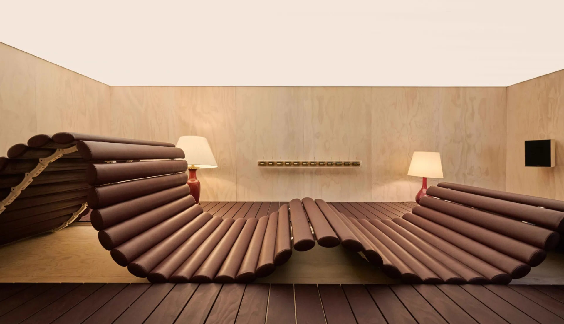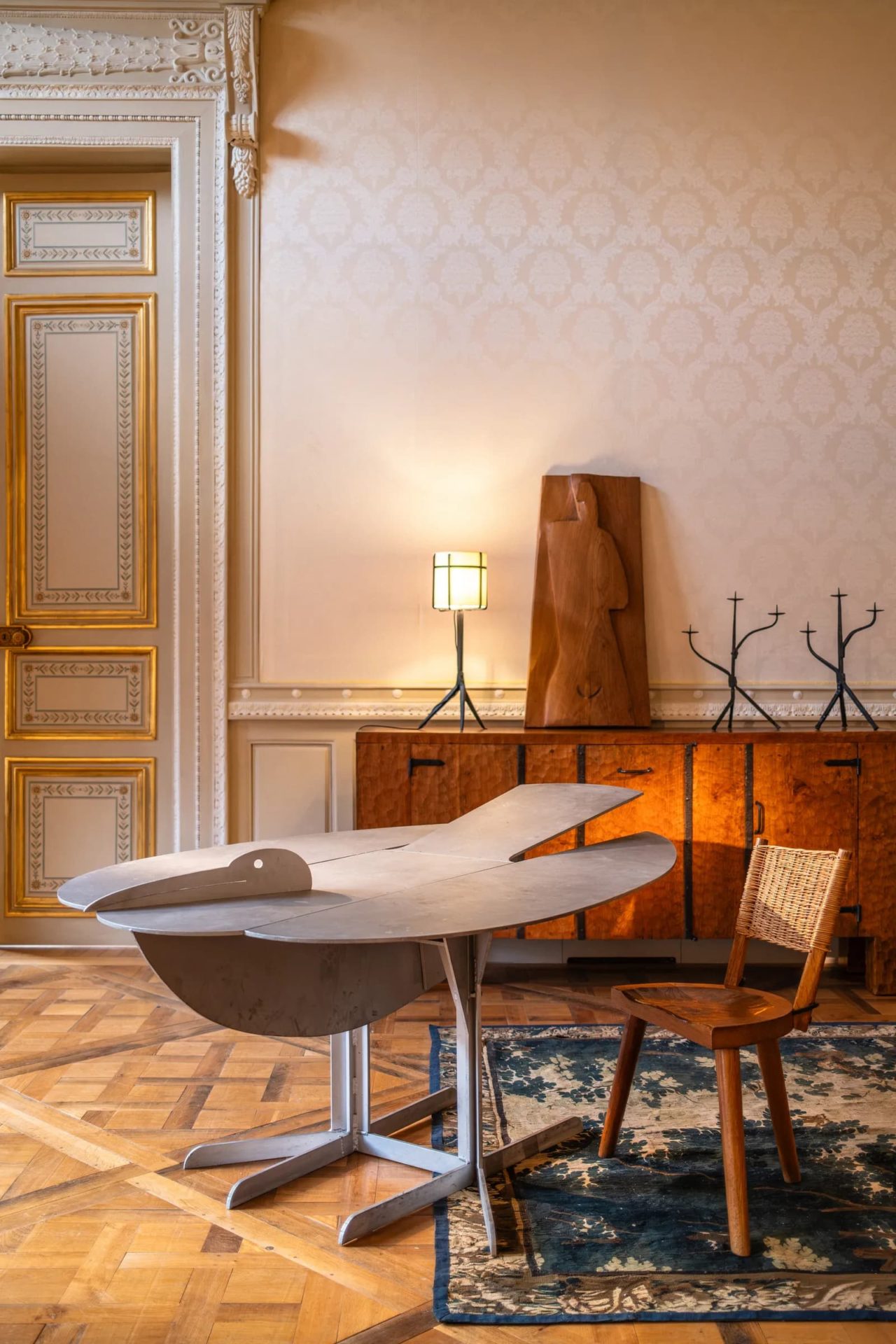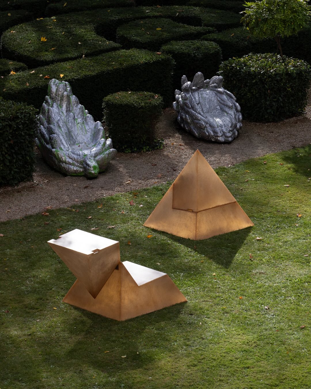 Les jardins de l’hôtel de Maisons ont notamment réservé de belles surprises. Exemple ? Les sculptures-assises Aerial Symmetry de Pedro Reyes pour ATRA. Six compositions en fibre de verre translucide, dont la gométrie, inspirée des pyramides, convoque la gravité comme la spiritualité. Toujours à l’extérieur, la table de ping-pong Resonating, Song N°1 de James de Wulf, façonnée en plaques d’aluminium, se métamorphose en table à dîner lorsque son filet disparaît. Mais sa singularité se loge dans sa musicalité. Les six plaques sont accordées sur une gamme pentatonique en la mineur. Résultat : chaque rebond devient note, et chaque échange, mélodie.