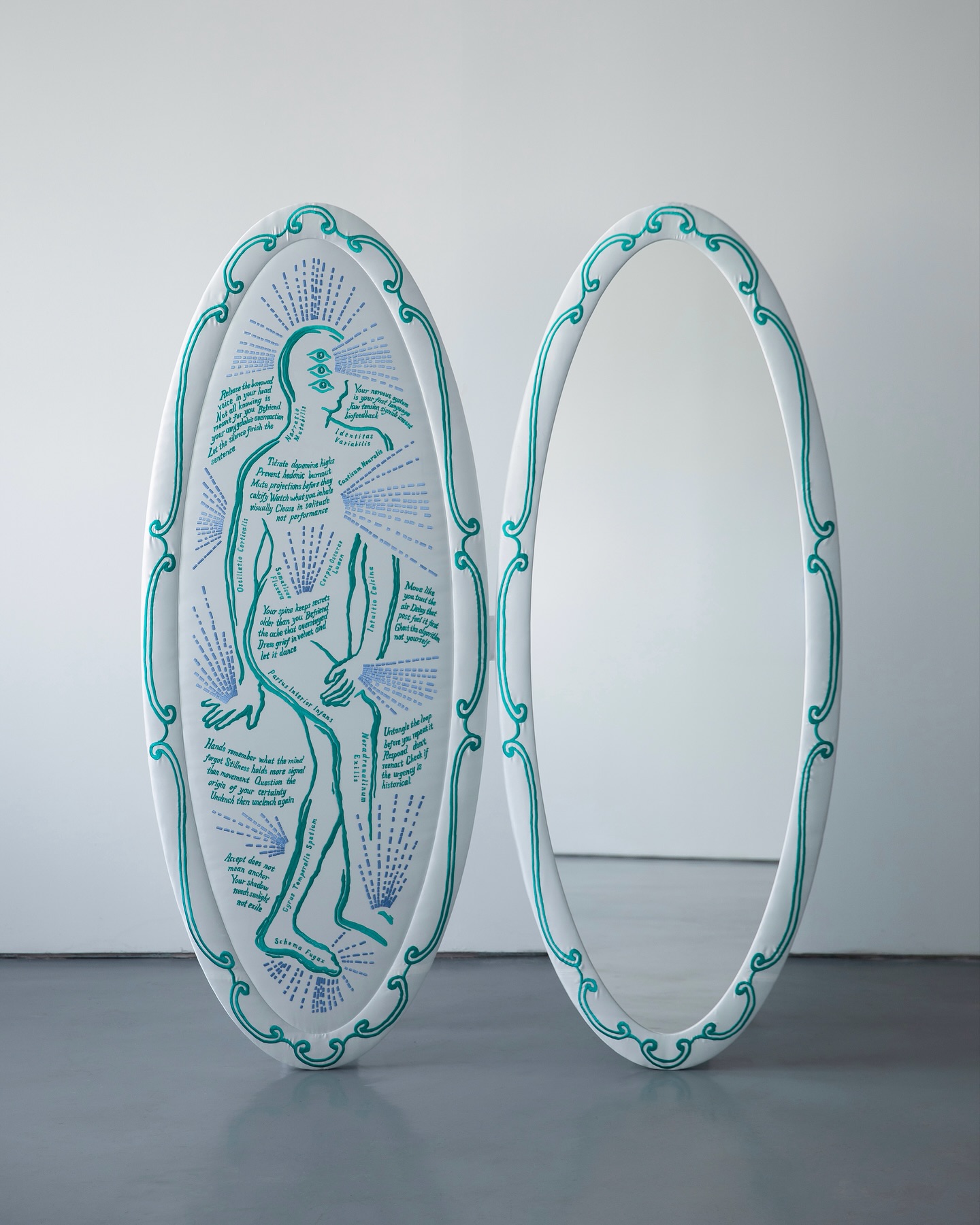 Dans un langage tout à fait différent, le miroir Noetigram v0.9 de Duyi Han (présenté dans le cadre du programme Designers of Tomorrow initié par Design Miami et Apple) marie artisanat textile et technologie. Sur une toile de satin brodé, l’IA génère des phrases nourries de thérapie cognitive et de pratiques somatiques.