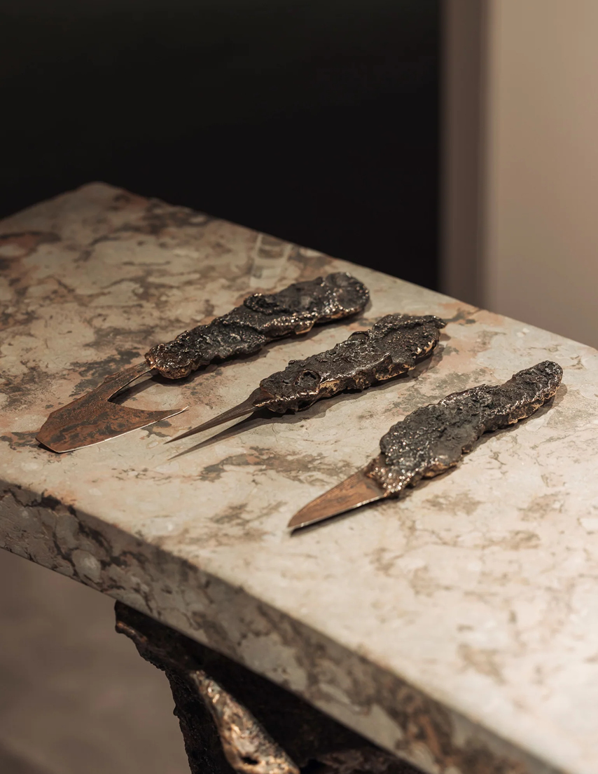 Avec « Time », Vladimir Slavov poursuit son exploration de la matière et de la transformation pour Objects With Narratives. Ses œuvres naissent d’un dialogue entre la texture, le toucher et la matière brute, un terrain où le geste et l’intuition façonnent chaque surface. L'artiste joue littéralement avec le feu, en tire des éclats de lumière et des émotions à vif. De cette alchimie surgissent des formes où se mêlent la délicatesse du geste et l’intensité brute de la création.