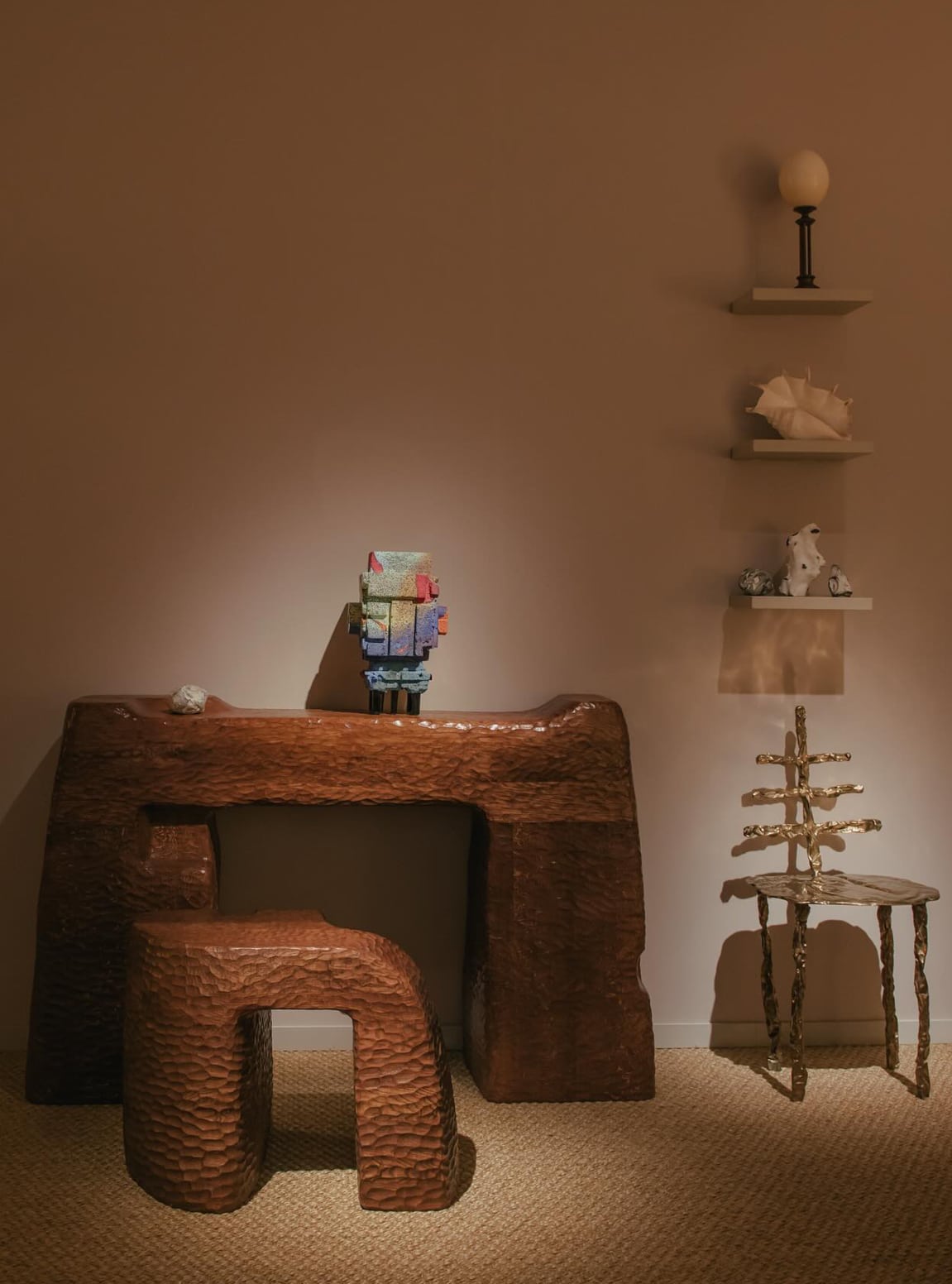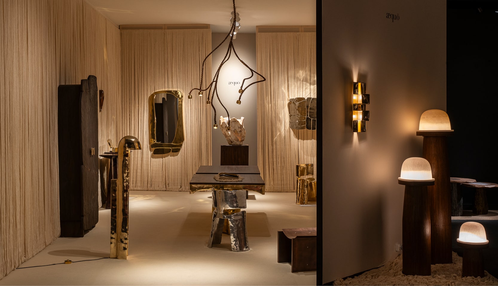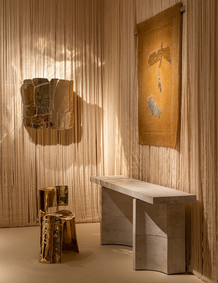 Fidèle à sa palette de cuivre et d’or, la galerie æquō, basée à Mumbai, a dévoilé une installation empreinte de douceur et de poésie, enveloppée de longs brins de coton écru non traité (la fibre brute du khadi, textile emblématique de l’Inde, filé à la main). Déployés le long des murs, ces fils dessinaient un paysage suspendu, rappelant les lignes de coton qui traversent les ateliers indiens avant le tissage ou la teinture. Dans cette atmosphère silencieuse, les pièces de Valériane Lazard, Inderjeet Sandhu, Linde Freya Tangelder, Gaia Pilens, Wendy Andreu, Frédéric Imbert et Florence Louisy semblaient en lévitation. Sculptées, taillées, coulées… elles portent en elles portent le poids de la main et la précision de la pensée.