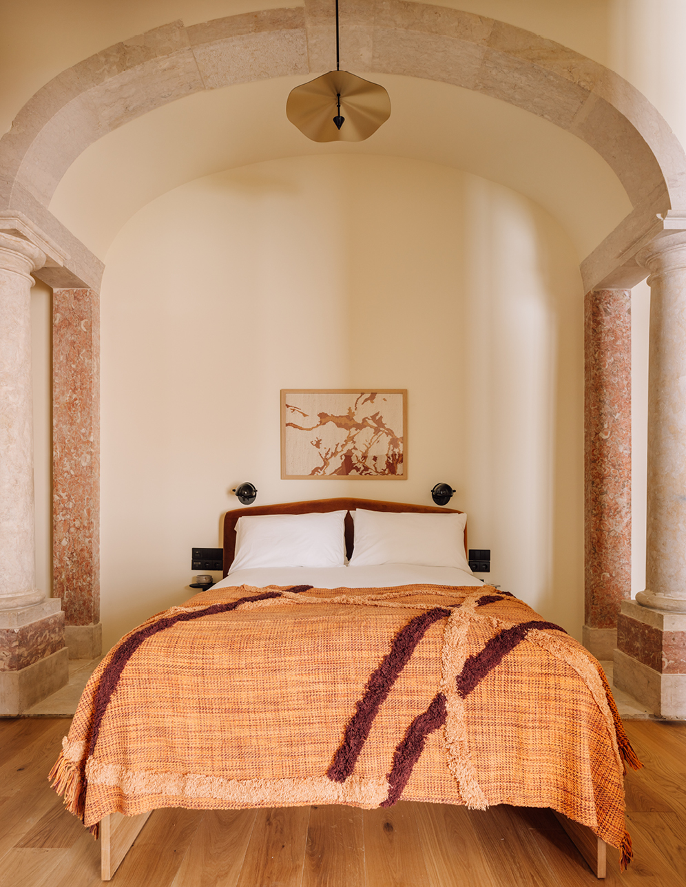 Après Londres, son premier point d’ancrage, puis Paris, Dublin ou Édimbourg, le groupe affirme sa présence à Lisbonne avec le plus grand établissement de la collection. Locke Santa Joana se déploie sur quatre bâtiments, dont un musée dédié aux artefacts découverts pendant la restauration, une piscine nichée dans une cour intérieure, des espaces de coworking et une salle de fitness. Partout, l’ancien et le contemporain s’accordent avec justesse. Sous la houlette d’Uncanny Studio, le nouveau décor met en lumière les traces préservées : des azulejos retrouvés lors des fouilles, mais aussi des colonnes et moulures d’un cloître d’inspiration renaissance.
