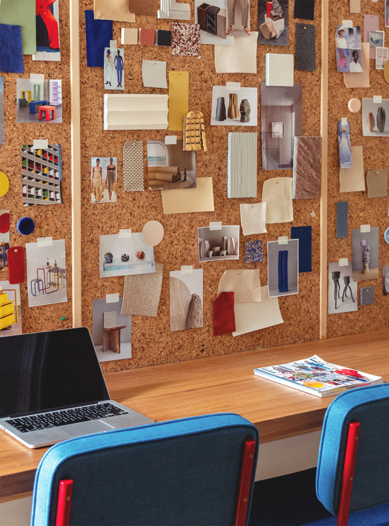 Dans la grande salle à manger, les tables en marbre rose ont été réalisées sur mesure et les chaises (Moroso) ont été colorées en tissu Kvadrat. Juste derrière, les vases en céramique du studio Ukrainien Faina cohabitent avec des jarres du XIXe sicèle chinées. La sérigraphie Color Slices est signée Goodmoods Éditions.