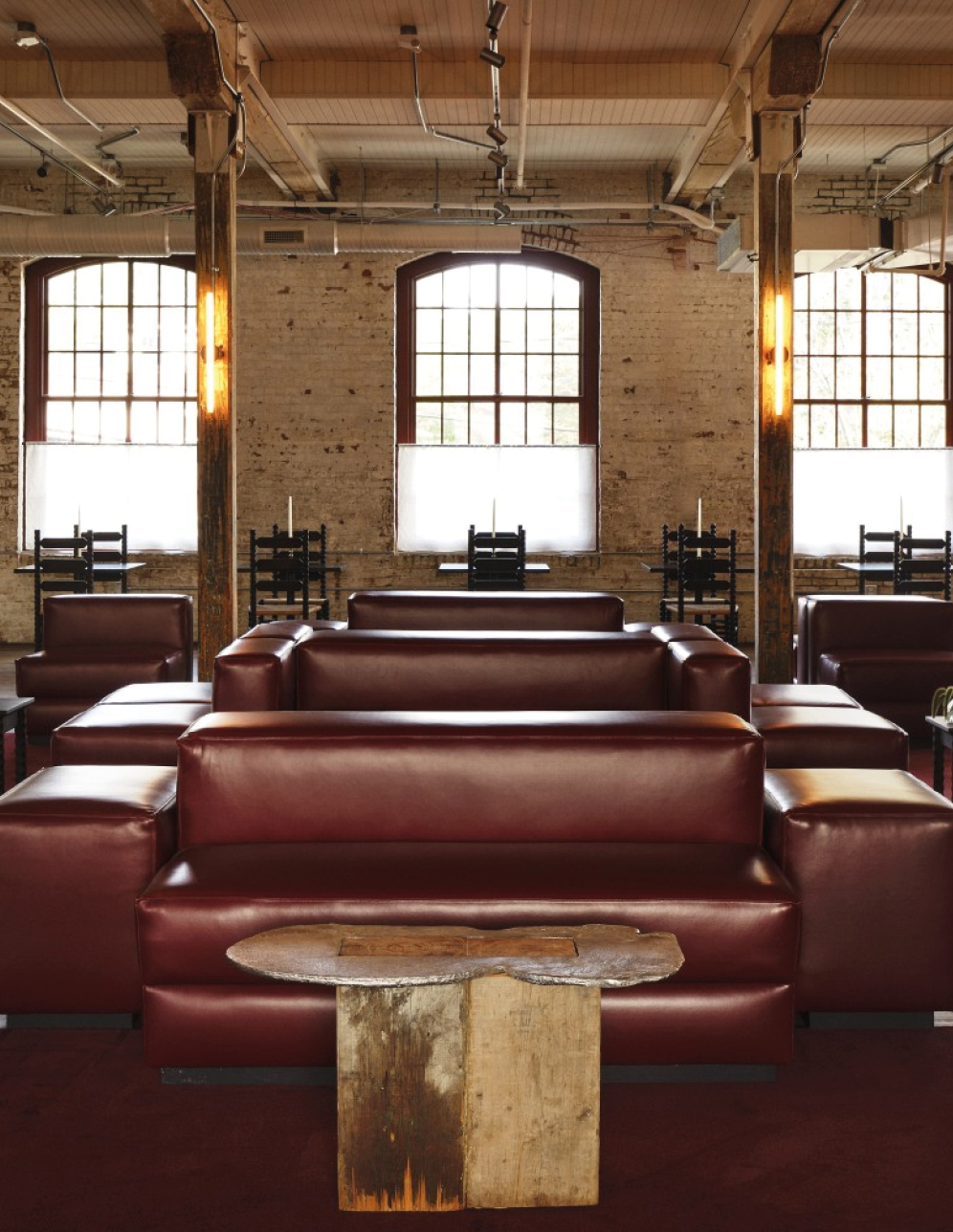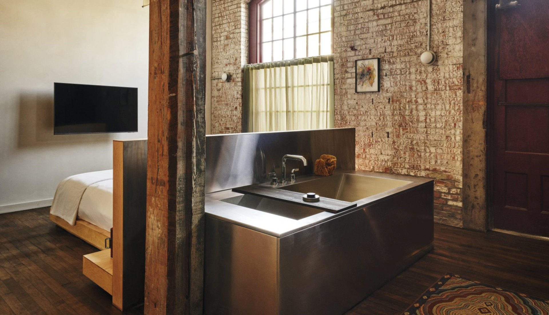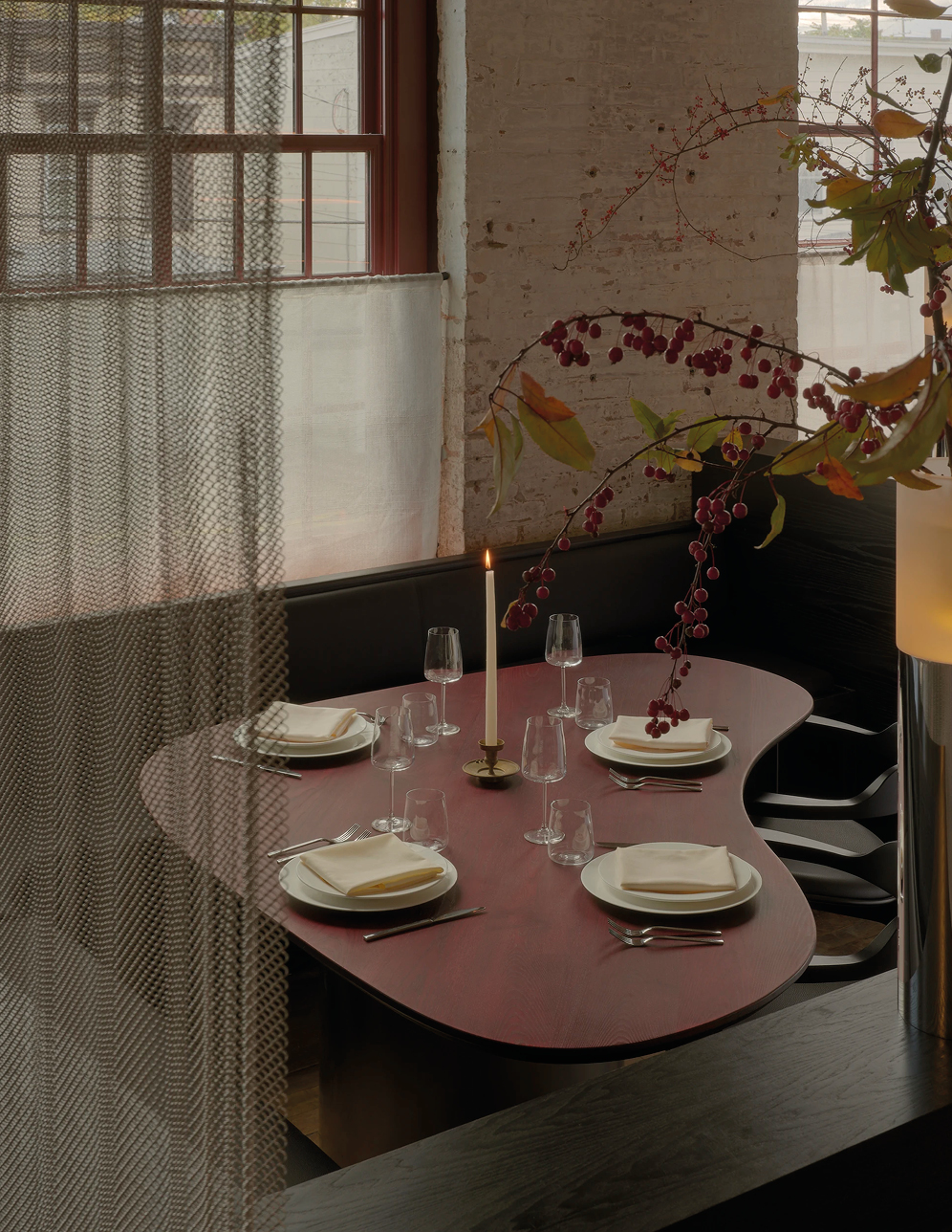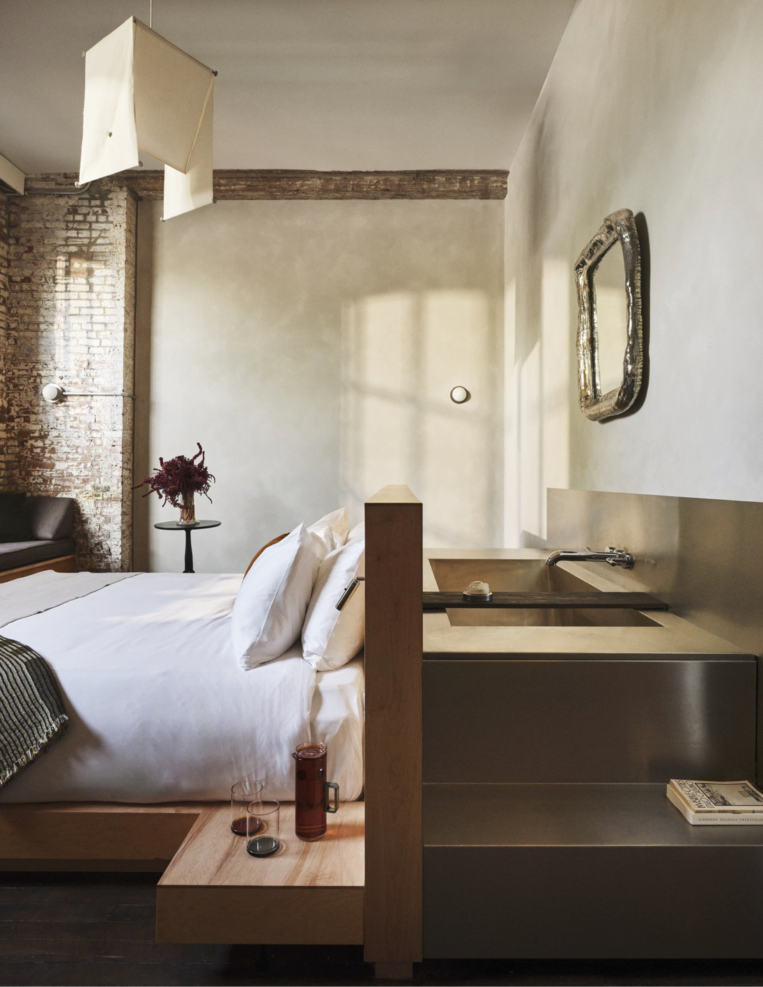 Pocketbook Hudson fonctionne comme une mini-ville créative : quarante-six chambres, une boutique Kasuri (concept-store new-yorkais aux références ultra pointues), des friperies bien sourcées, un nightclub, un restaurant dédié à la fermentation et, bientôt, un établissement de bains. Le lieu fait aussi office de hub d’art et de design contemporain, avec une sélection de designers et de galeries affûté où dialoguent Misha Kahn, Jacqueline Sullivan, Rich Aybar… Les intérieurs signés Charlap Hyman & Herrero orchestrent la rencontre entre héritage brut et raffinement discret : briques d’origine, mobilier en bois épuré, textiles doux, acier minimaliste et détails manifestes comme les cottes de mailles suspendues au restaurant. Un condensé de l’esprit Hudson : industriel, culturel, accueillant et vivant.