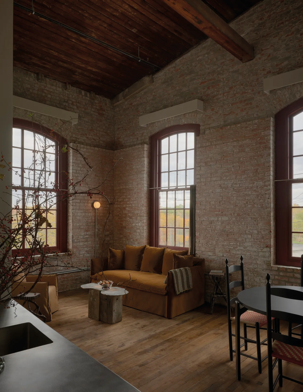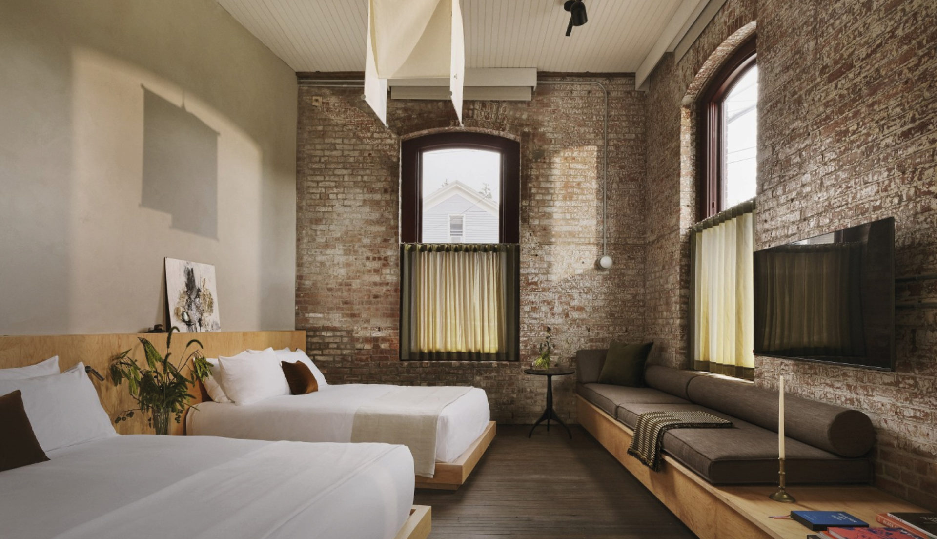 À 2h30 de Manhattan, sur la rive Est du fleuve Hudson, la ville du même nom a mué au fil des années : ancien territoire mohican, berceau industriel de l’âge d’or américain, et aujourd’hui refuge de créatifs, de la communauté LGBTQ+ et des chineurs d’antiquités aguerris. Au cœur de ce paysage, l’ancienne Pocketbook Factory, un bloc entier autrefois dédié au textile, racheté en 1992 par l’architecte d’intérieur Eleanor Ambos pour préserver son héritage et depuis classé monument historique, écrit un nouveau chapitre sous le nom de Pocketbook Hudson. Ni simple hôtel, ni énième friche reconvertie, l’adresse est pensée comme une retraite artistique d’un nouveau genre.
