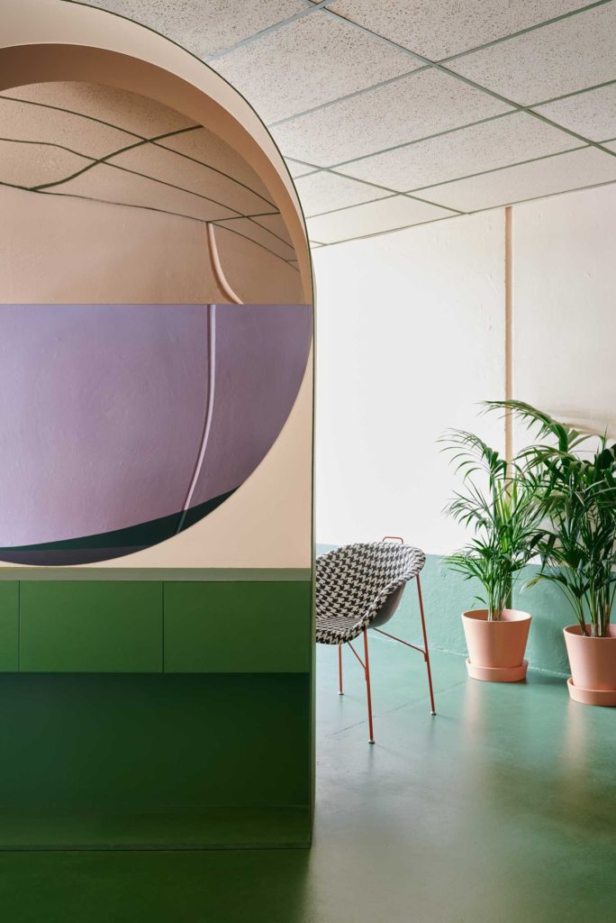 Tirés sur un pans entier de mur et teintés uniformément de nuances édulcorées, les voilages habillent l’intérieur d’une lueur colorée. Une manière de donner du volume aux espaces tout en filtrant la lumière avec une atmosphère ludique et onirique.