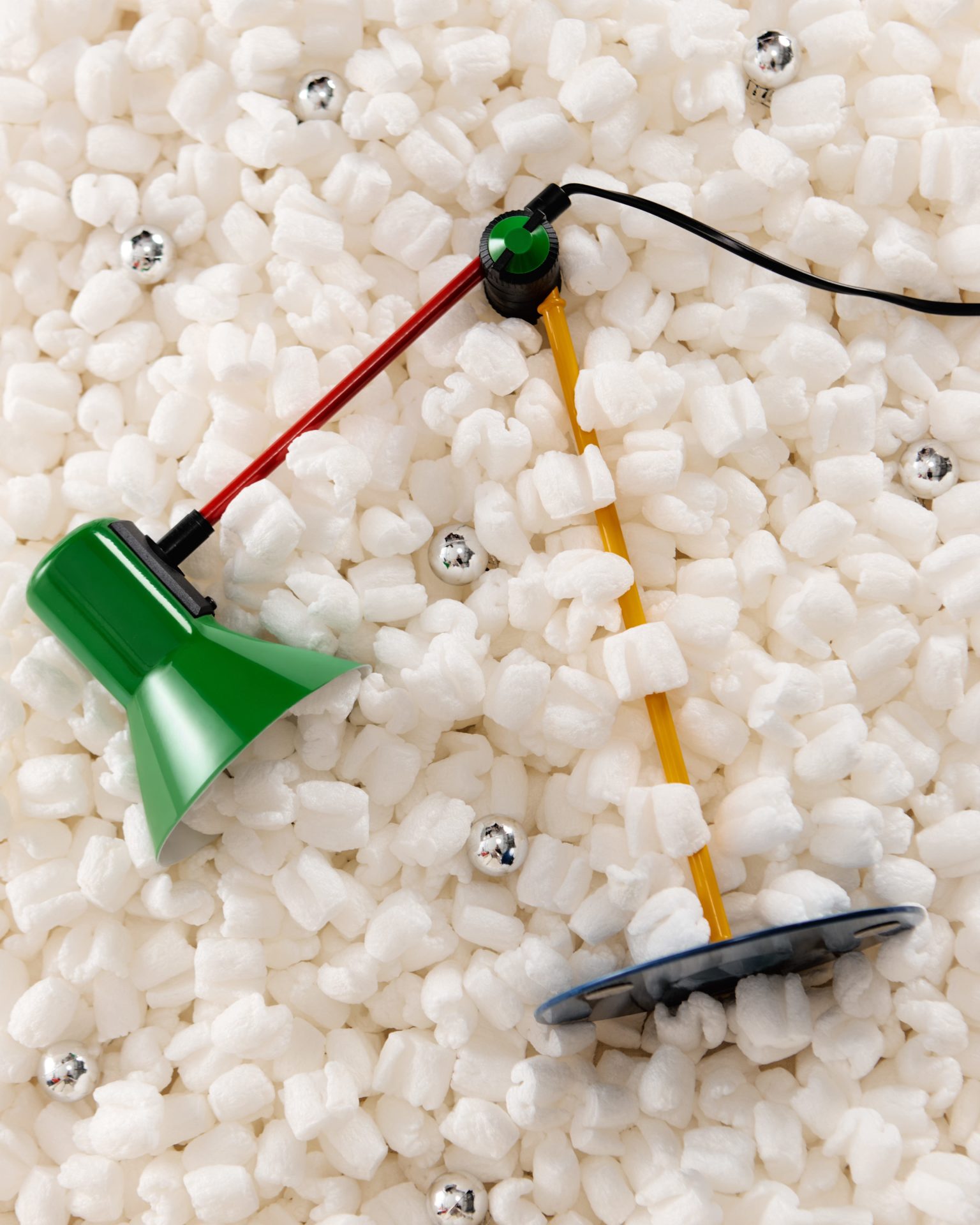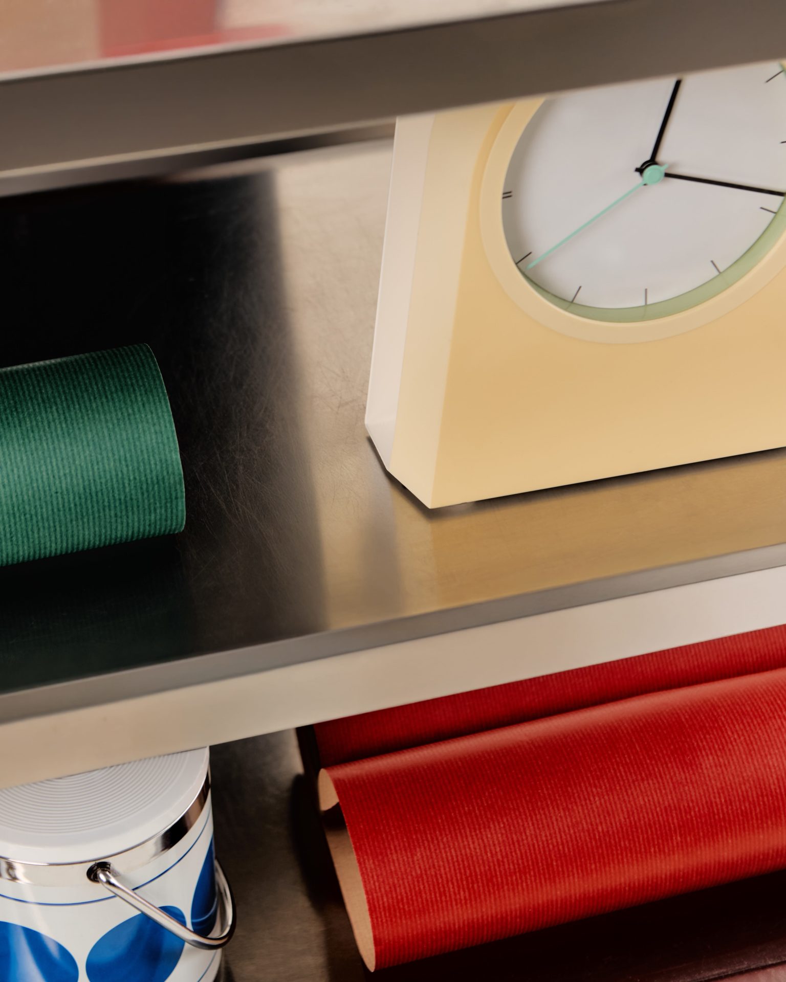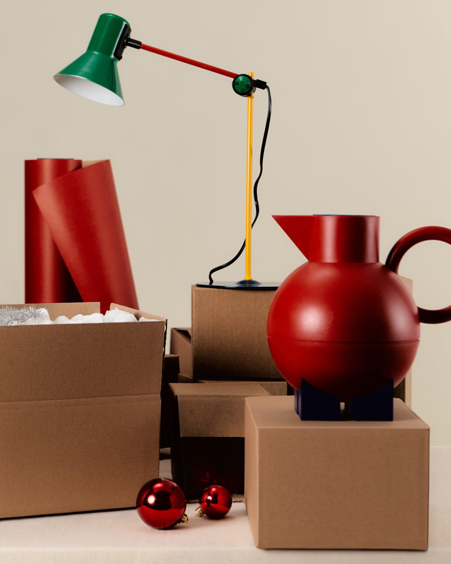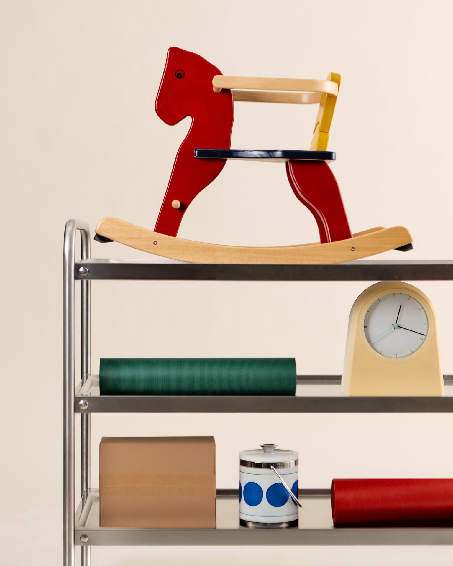 Dans ce joyeux chaos, des objets de design vintage émergent : une cafetière-thermos Alessi, un cheval à bascule en bois multicolore, une lampe de bureau articulée dans le style Memphis, une lampe Bambina rouge, un seau à glace 70’s, une horloge POFFARE d’IKEA… autant de trésors inattendus de seconde main, prêts à être chinés sur leboncoin avant leur grand voyage.
