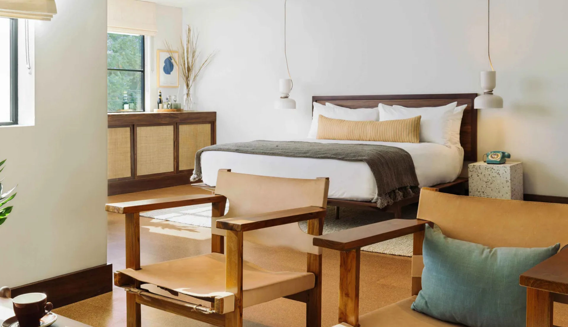 C’est précisément dans ce décor, plus village que mégalopole, que s’est installé le Silver Lake Pool & Inn. À l’intérieur, une réception compacte mais finement pensée, des matériaux chauds, des lignes épurées. Dans les chambres : parquet clair, tons sable et terre cuite, grandes baies vitrées ouvertes sur les palmiers, et certaines sur le Hollywood Sign et l’Observatoire Griffith. L’atmosphère est immédiate : on est à L.A., dans sa version solaire, mais minimaliste, avec en fond un design Mid-century modern qui rappelle que Richard Neutra et John Lautner ont marqué l’histoire architecturale à quelques patés de maison. Le cœur de l’hôtel se trouve sur le rooftop. Une piscine rectangulaire, quelques transats rayés, une vue dégagée sur les collines.