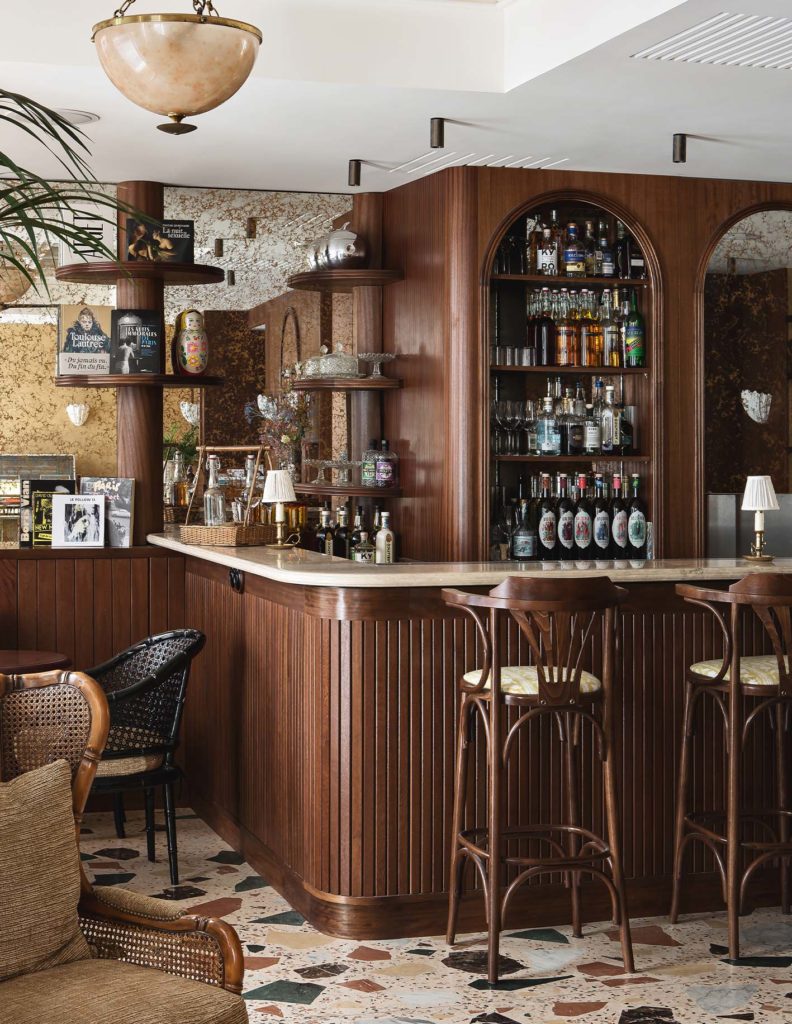 Rococo et Art Déco, maximaliste et romantique : imaginé comme une maison de collectionneur, l’hôtel renaît dans un éclectisme franco-britannique à la Madeleine Castaing et David Hicks. Dissimulés aux quatre coins de ce décor exubérant ? Des pièces chinées par Luke Edward Hall : une affiche d’exposition parisienne vintage, des carafes à whisky en cristal ciselé, un guéridon en rotin tressé… Des objets de charme à retrouver sur leboncoin.