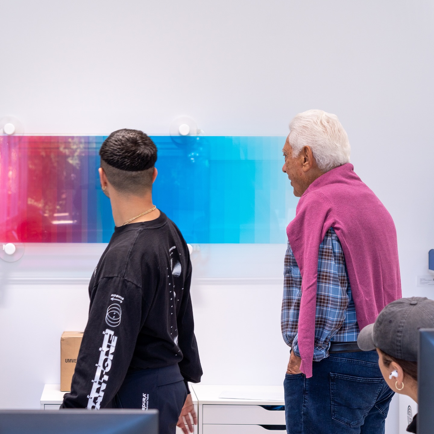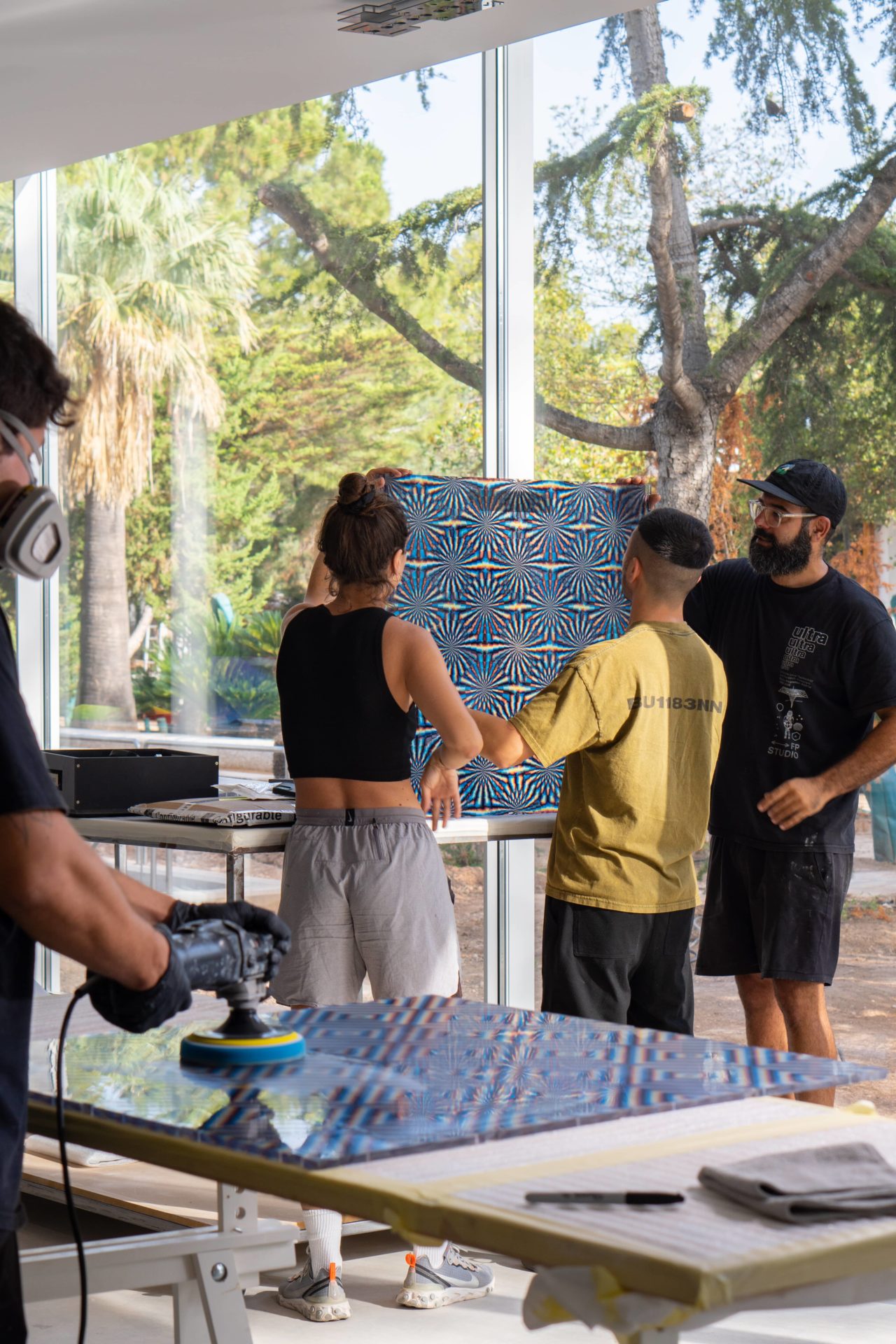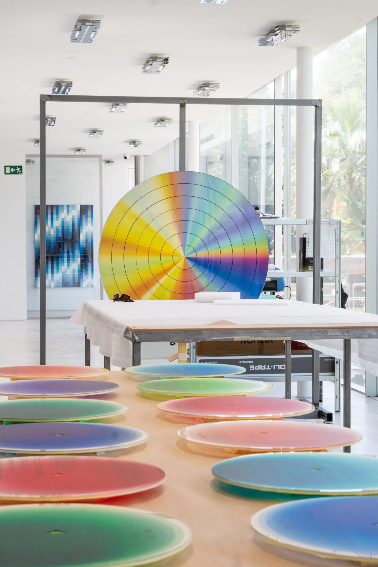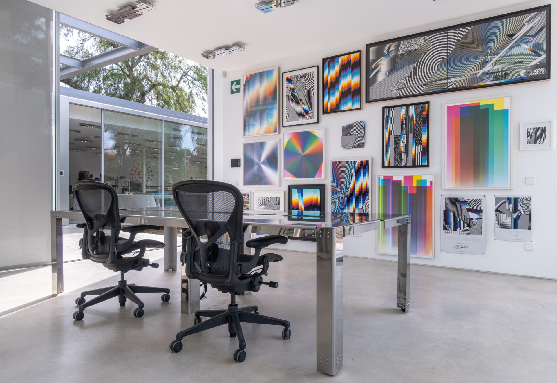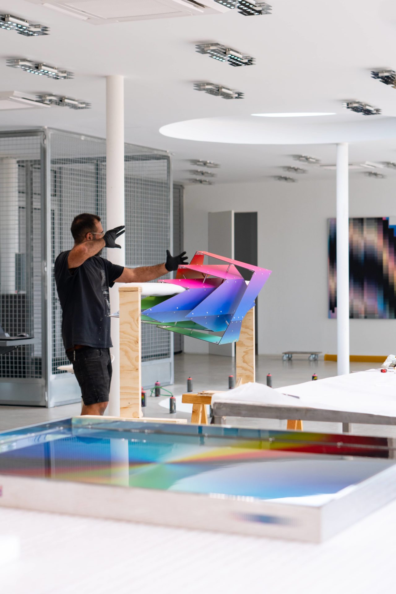 Aujourd’hui, après être passé de la rue aux galeries internationales, il pousse encore le curseur artistique en créant sa résidence d’artistes, Casa Axis. Son projet le plus ambitieux à ce jour prend place à L’Eliana, près de Valence, au cœur d’une architecture Space Age signée Antonio Segura. Expérimentale et radicalement singulière, cette maison spectaculaire (elle a servi de lieu de tournage de l’épisode Beyond the Sea de Black Mirror), est résolument propice à la création. Là-bas, les équipes de Felipe Pantone prolongent sa vision : dégradés hypnotiques, motifs pixellisés et technologies (algorithmes, impression 3D…) dialoguent avec des œuvres in situ d’artistes contemporains invités à faire mûrir leur travail en résidence.