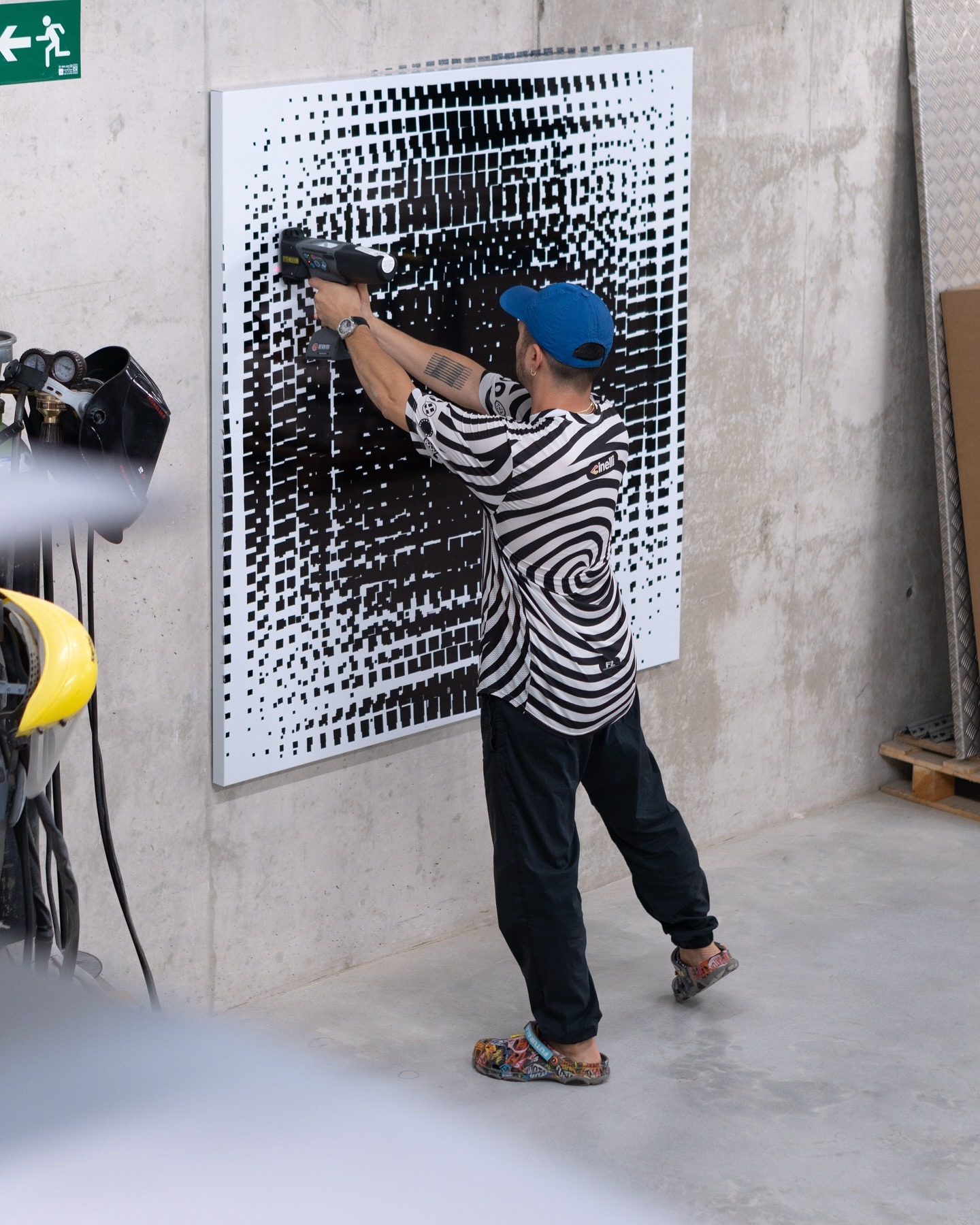 Figure majeure du néo-cinétisme contemporain, l’artiste argentino-espagnol Felipe Pantone a débuté dans le graffiti sous le pseudo Pant1, couvrant les murs de ses expérimentations techno-chromatiques avant d’étendre son terrain de jeu aux avions, monoplaces de F1 et buildings entiers avec son art cinétique.