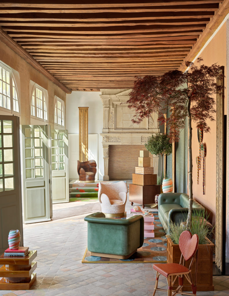 Là-bas, arbres, plantes et papillons pollinisaient les références contemporaines proposées par mohd. Parmi eux, les fauteuils Lazybones de Studiopepe, les Pacha de Gubi, la table Allure O’ de B&B Italia, les lampes de table Kokeshi de Pulpo… Le tout composait un écosystème doux, sensible et onirique.