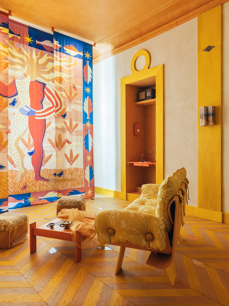 Au programme ? Des curiosités colorées qui explorent la matérialité à travers des formes et des impressions étranges, hommages à leur patronyme. Notamment Guise, une série de consoles, vases, paravents découpés dans du polystyrène expansé, puis recouverts de laque automobile en spray ou peints selon l’art du scagliola (stuc marbre). Ou encore le porte-CD en plâtre et en liège mélangé réalisé pour l’Aram Gallery.
